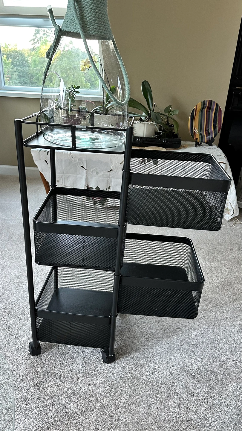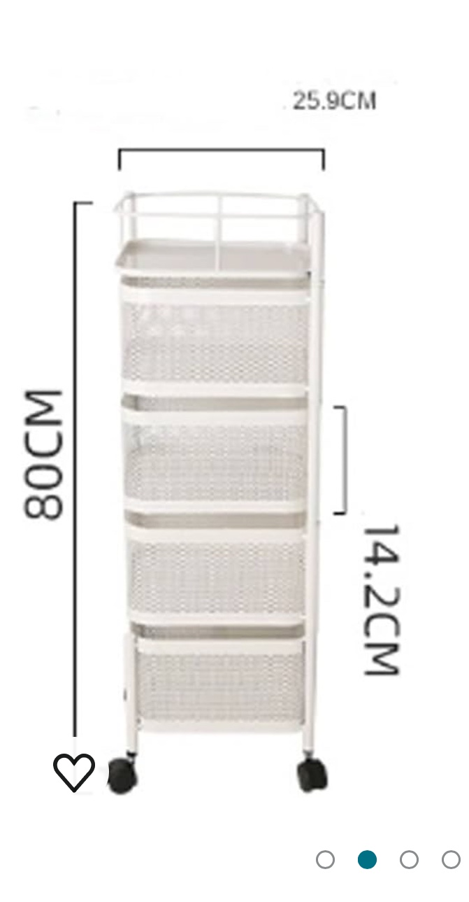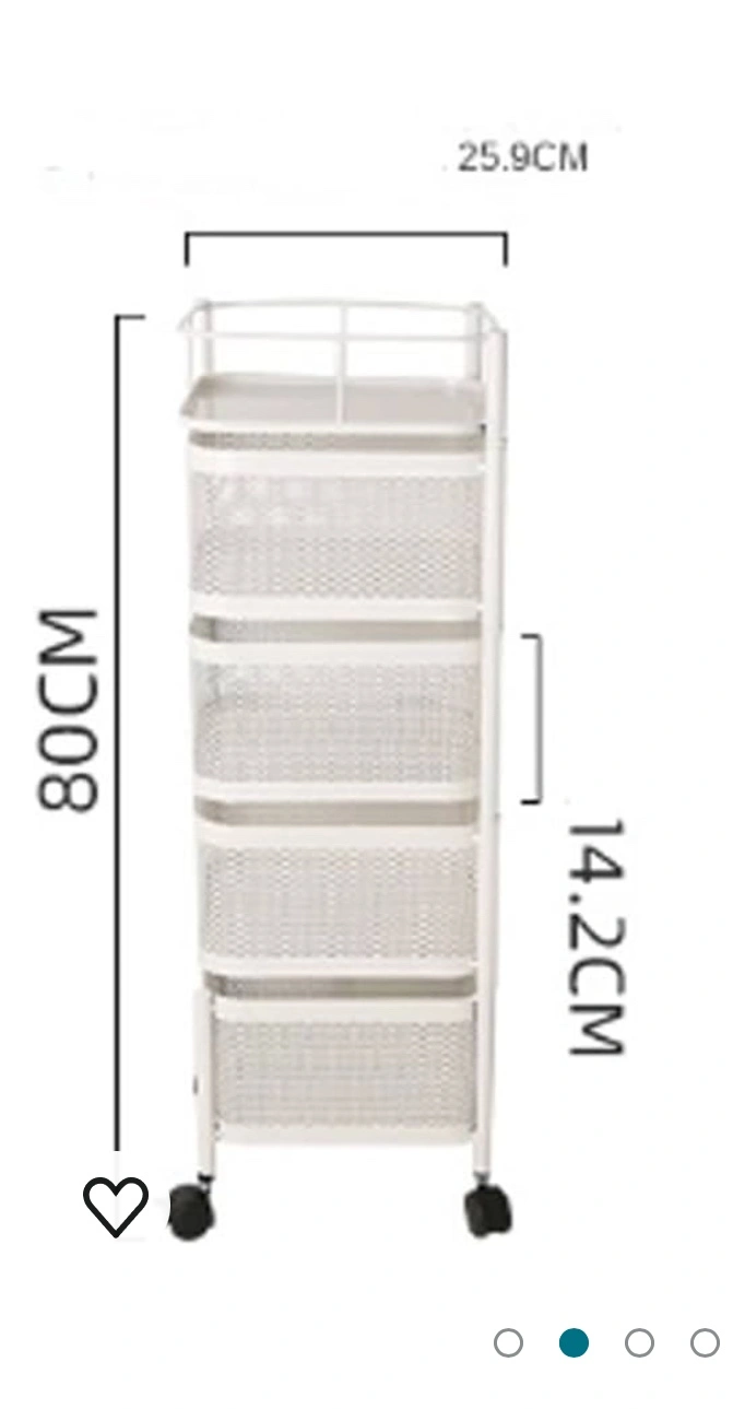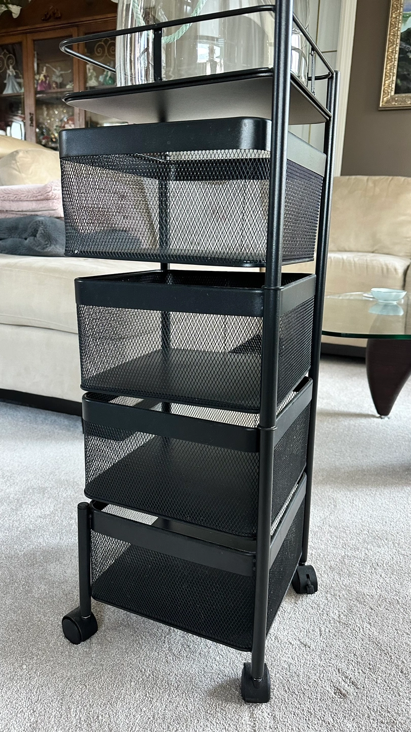 This rolling cart features four tiers of wire baskets It has wheels for easy mobility.