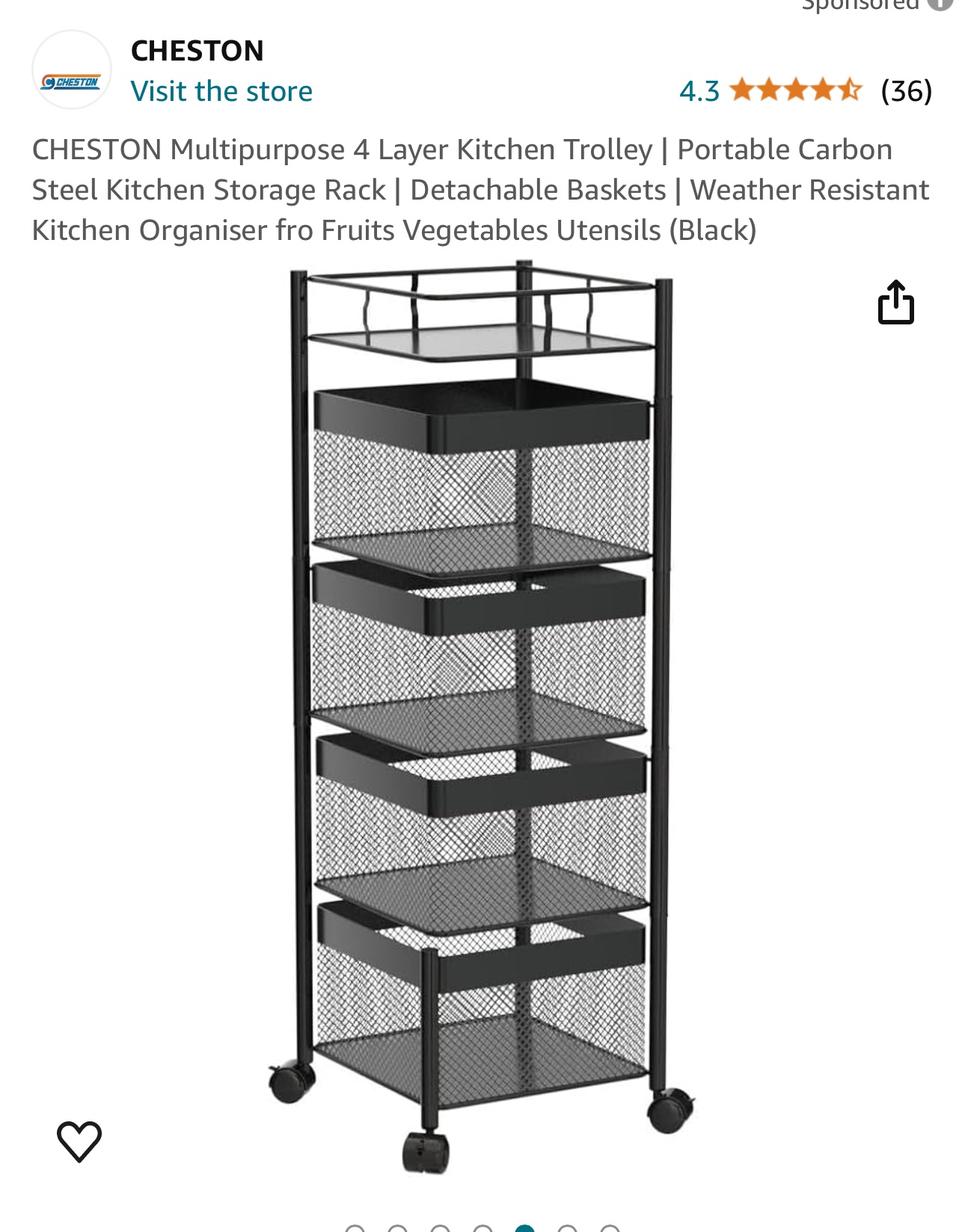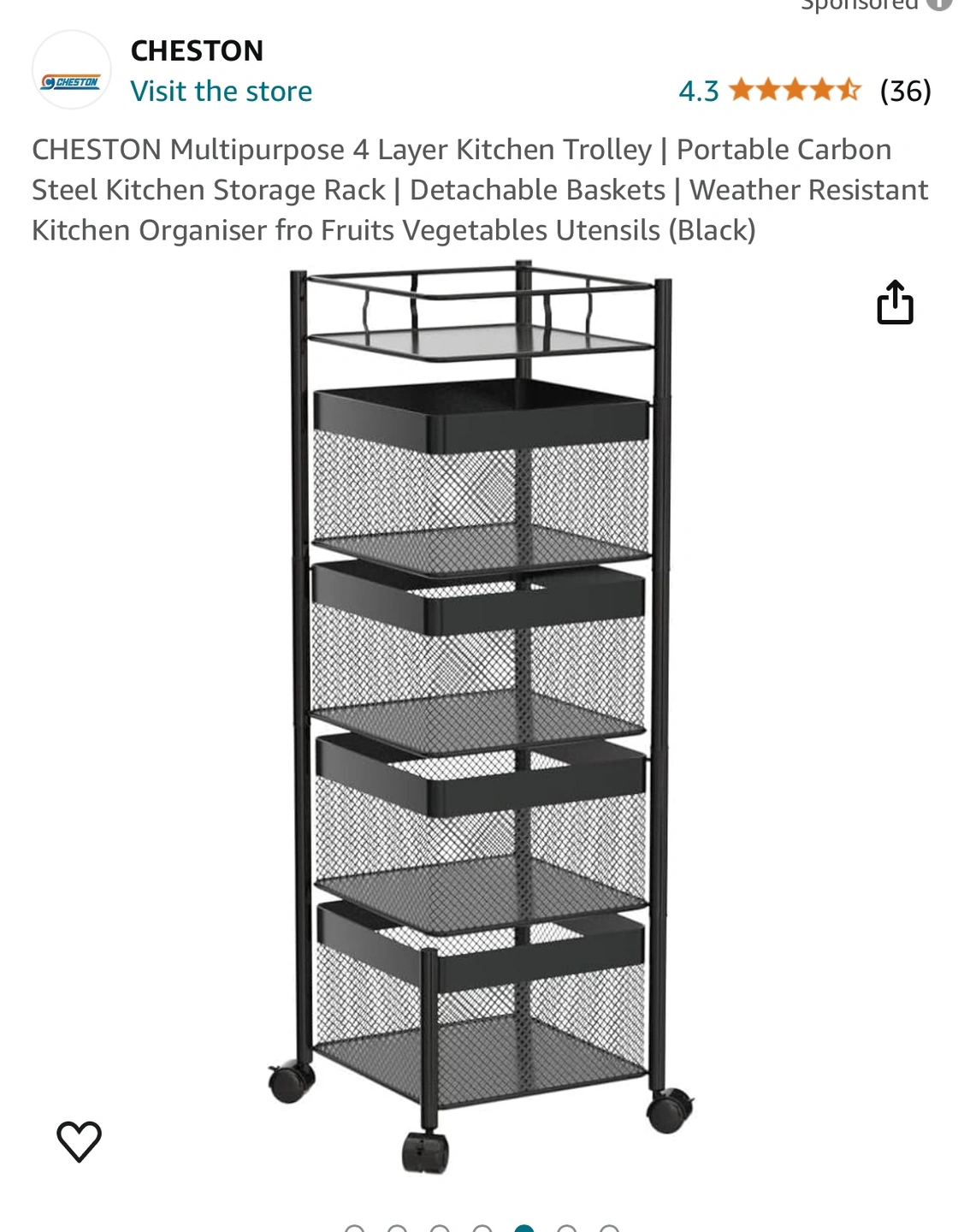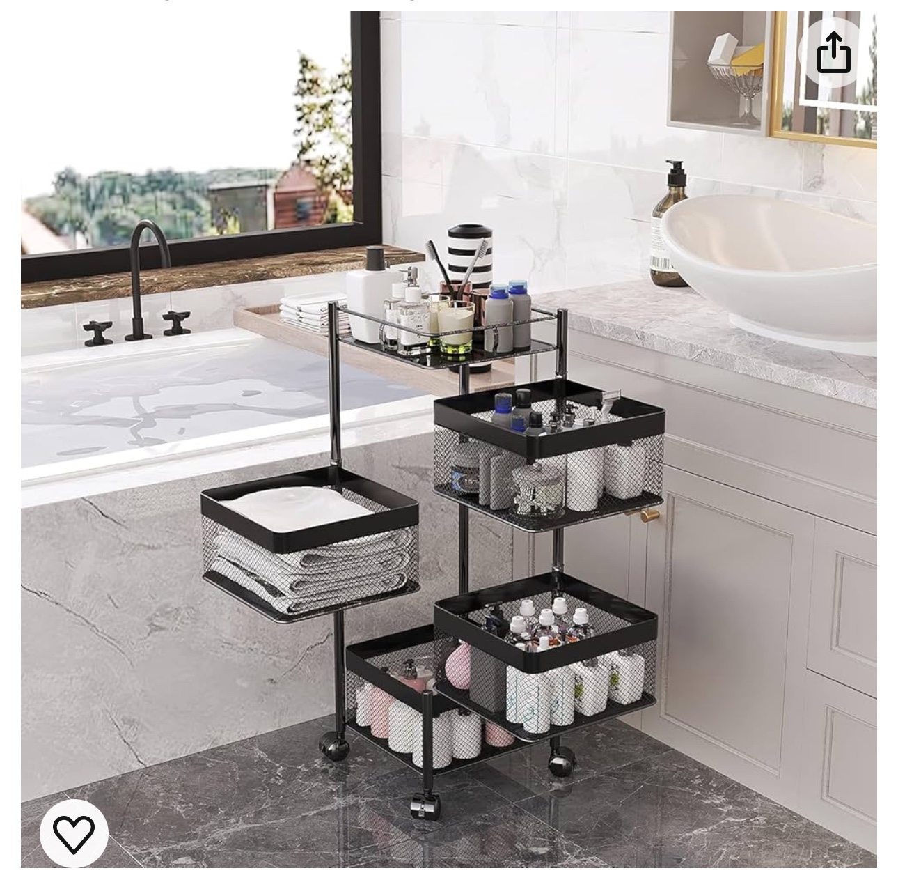 This rolling cart features four tiers of wire baskets It has wheels for easy mobility.