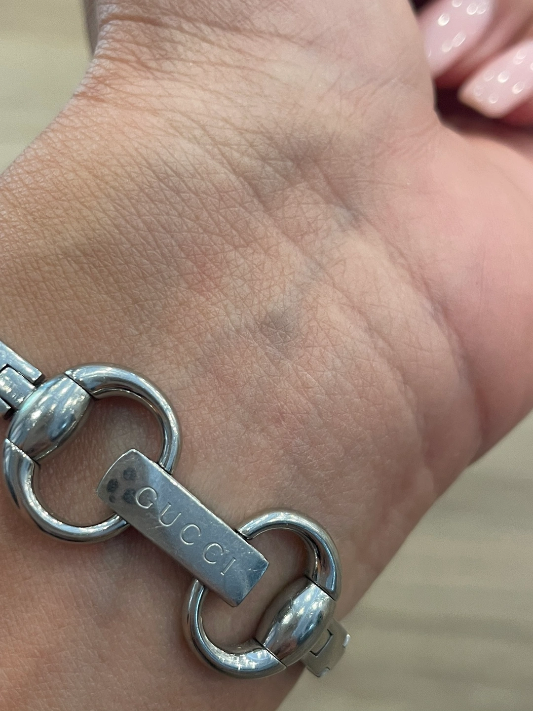 This is a classic Gucci women's watch with a silver band and a black face. The watch is in good condition! Genuine.