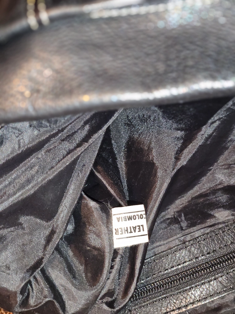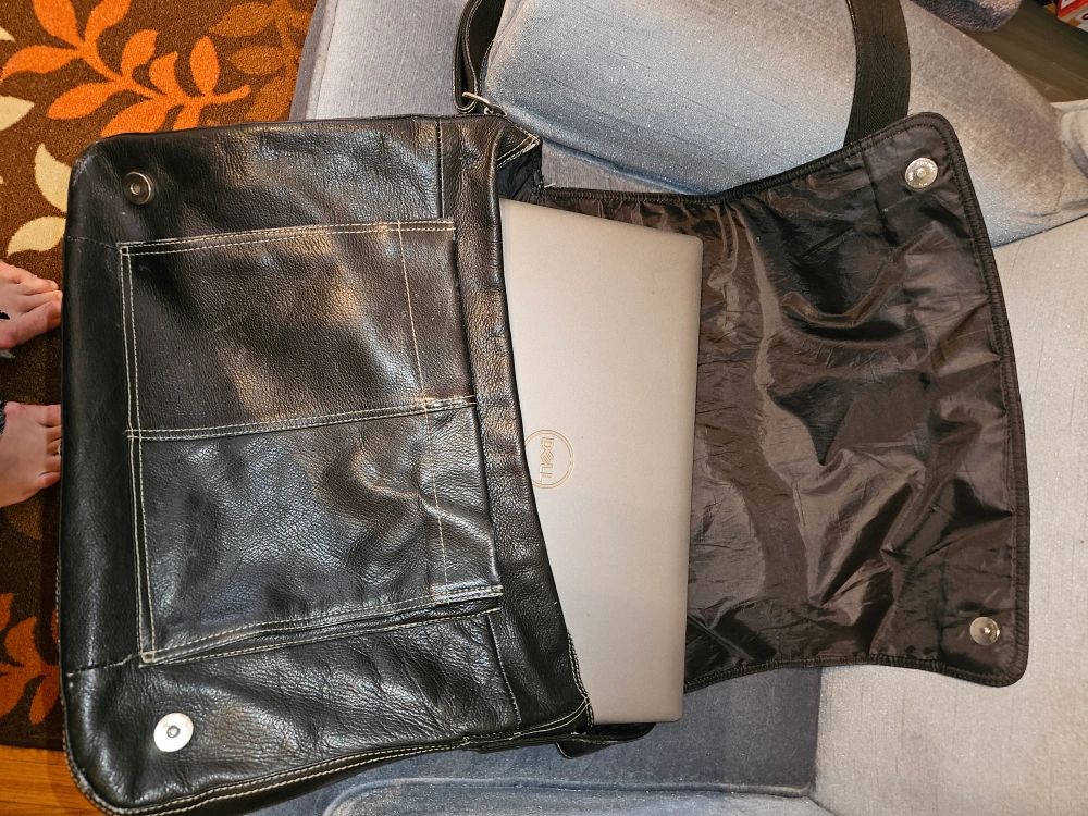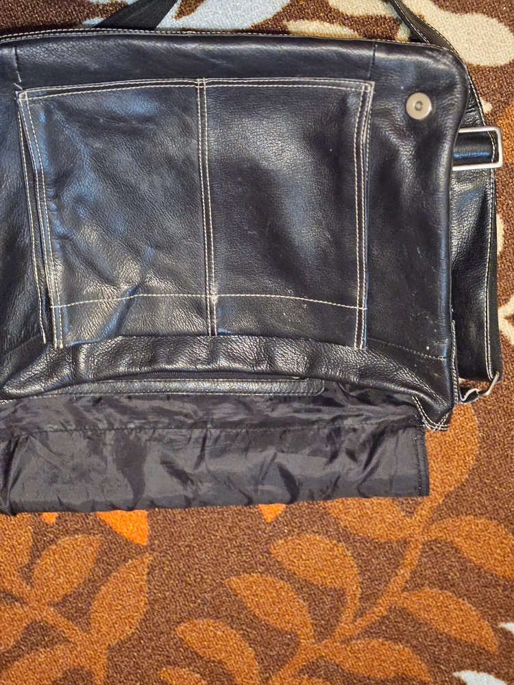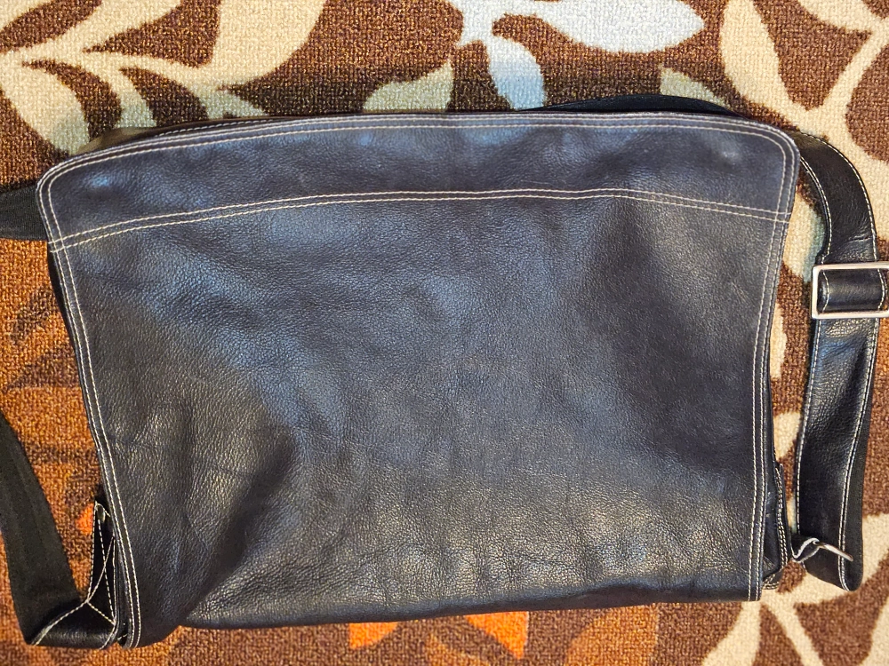 Large black leather bag with an adjustable strap and a pocket on the front. zipper pocket inside padded compartment inside, great for a laptop. The bag is in great condition.