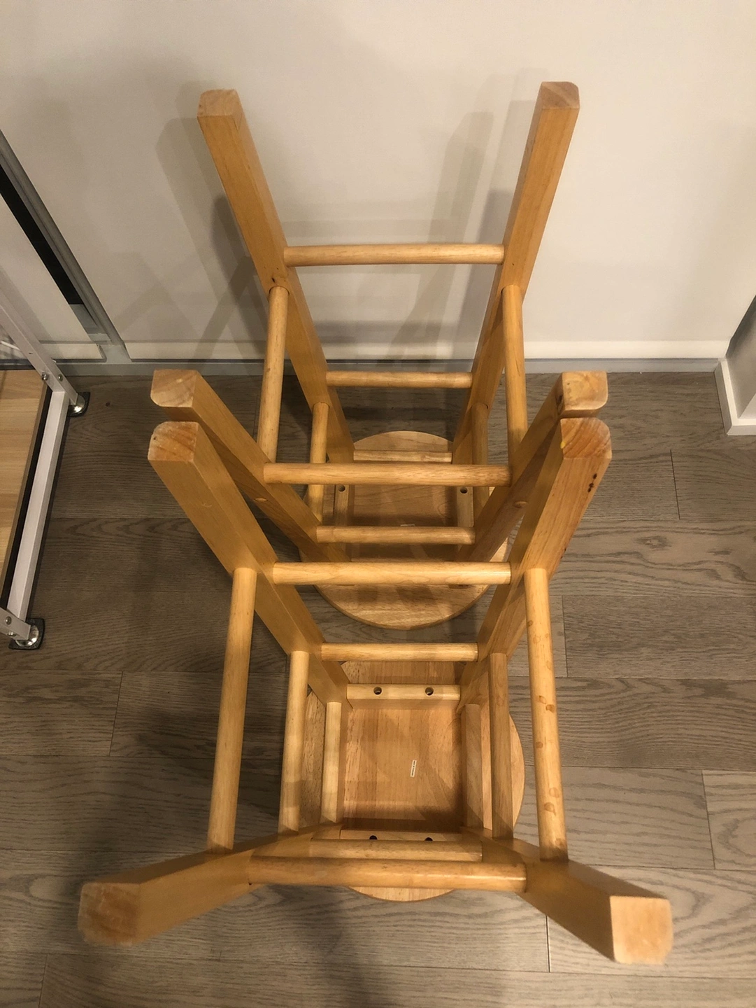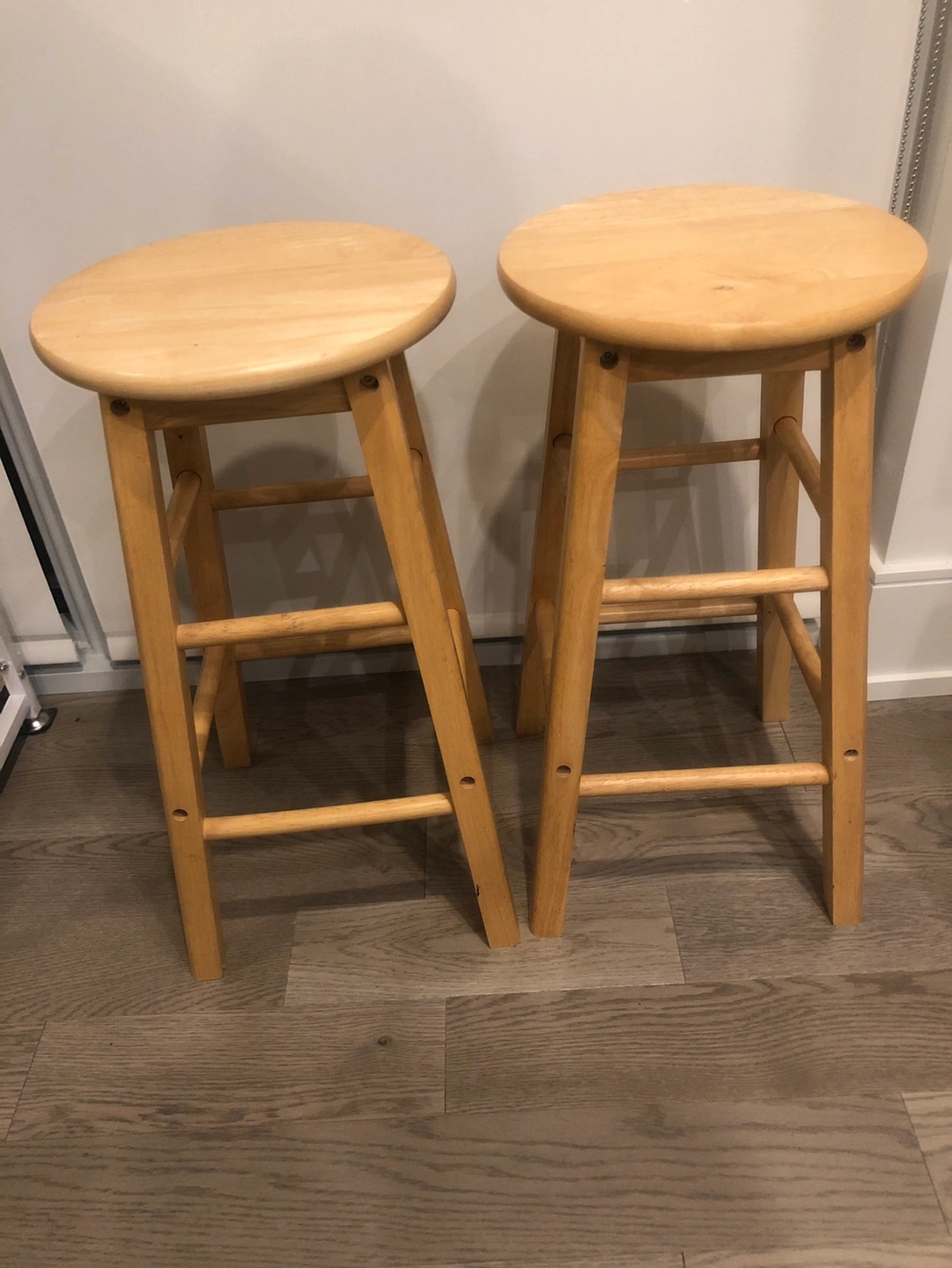 Two 24β wooden kitchen stools with round seats and a simple design. Excellent condition, Moving Sale.