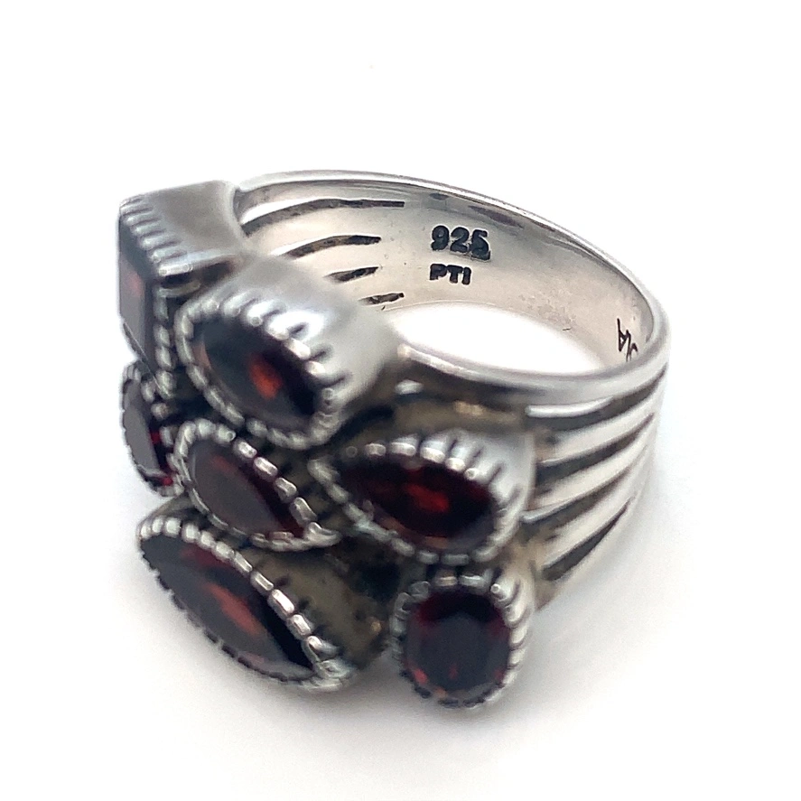 Sterling silver ring with 7 red garnets. The ring is size 6. It’s absolutely gorgeous in person