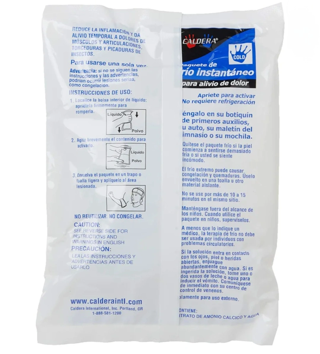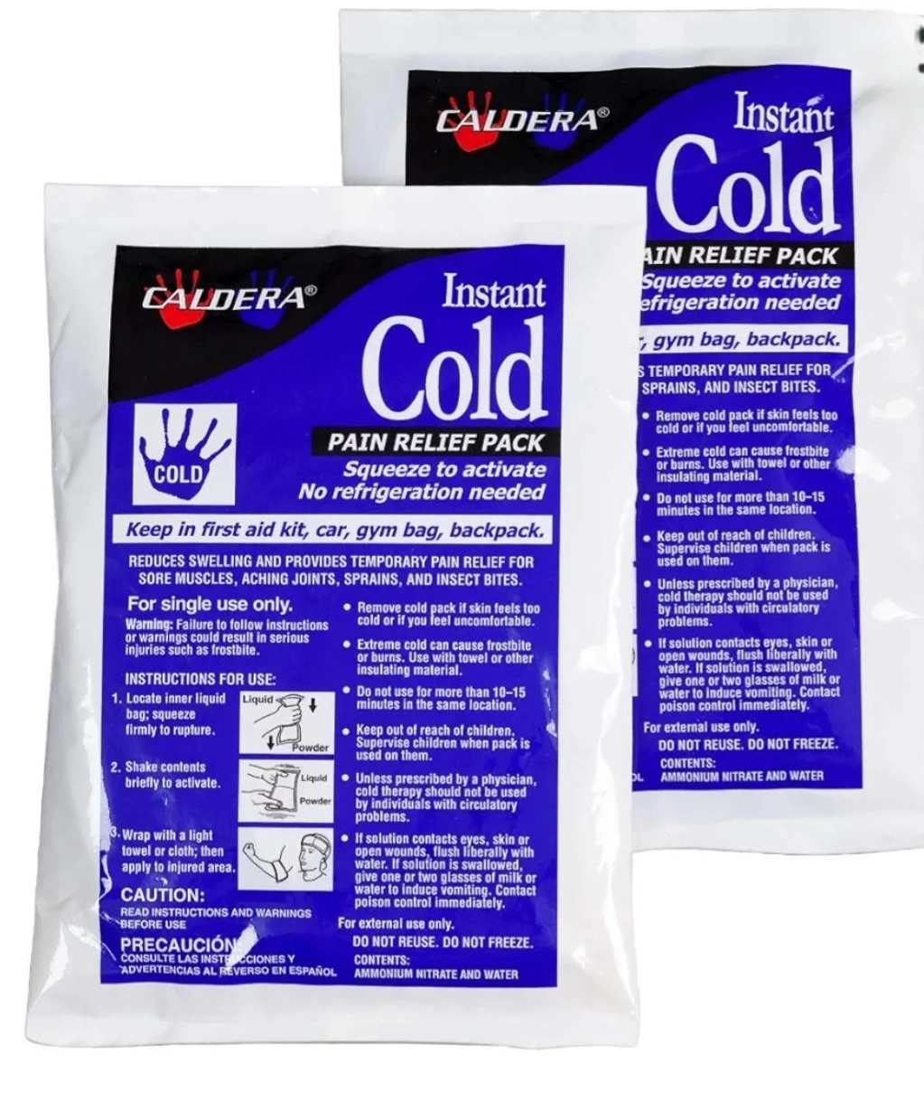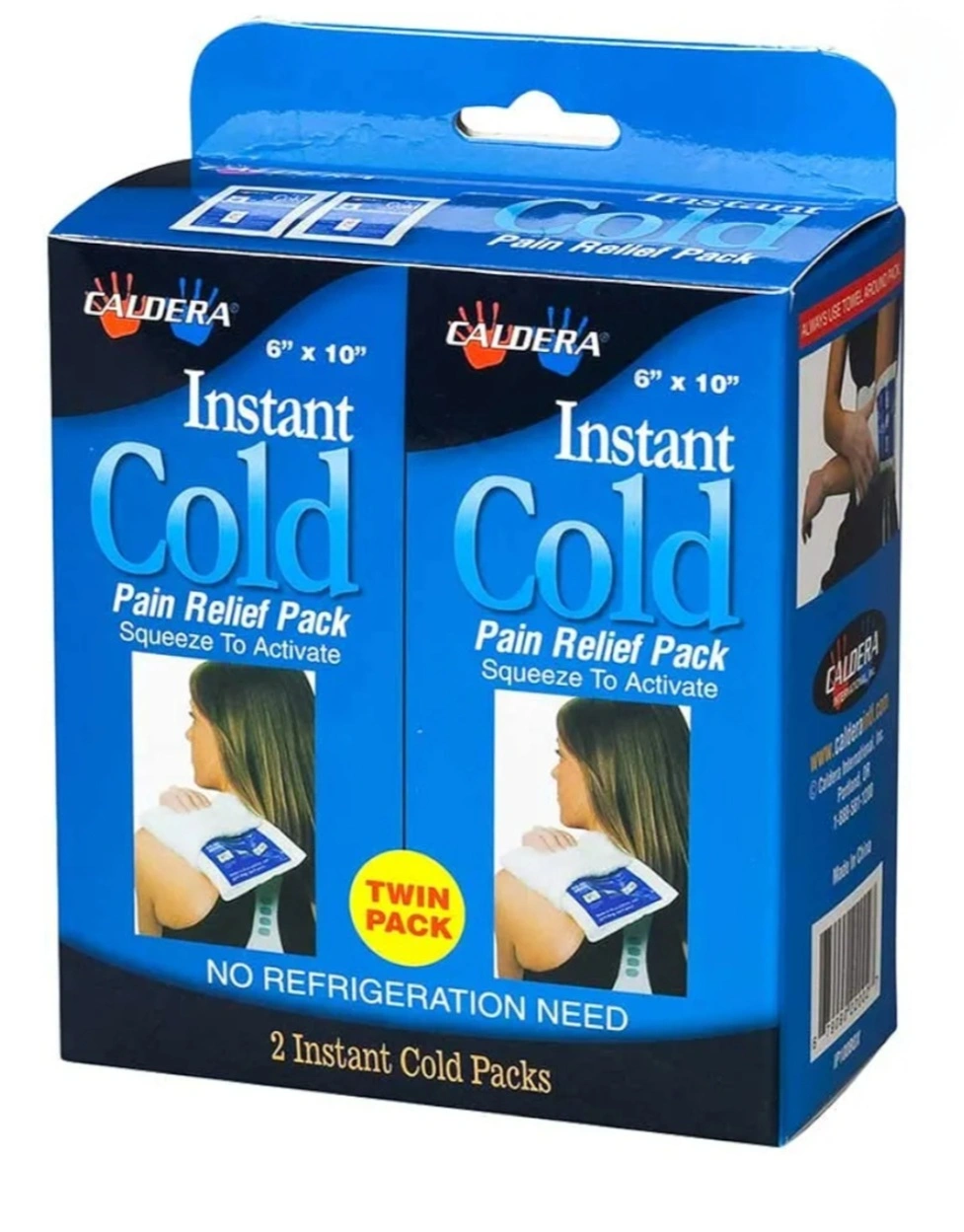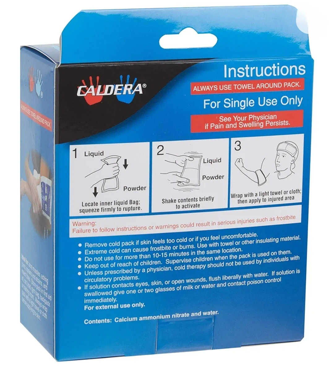 The Caldera 6" X 10" Instant cold pain relief pack is a single use disposable product. Squeeze to activate, no refrigeration is needed. Instant cold pain relief pack is ideal for sore Muscles, aching joints, sprains and strains, and insect bites. Store your instant cold packs in a first aid kit, car, boat, gym bag, backpack, or training room.