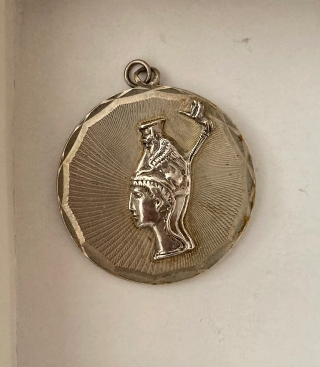This pendant features a Pharaoh profile It is a round pendant with a raised edge. It has a bale at the top for attaching to a chain. Very elegant on a dark top.