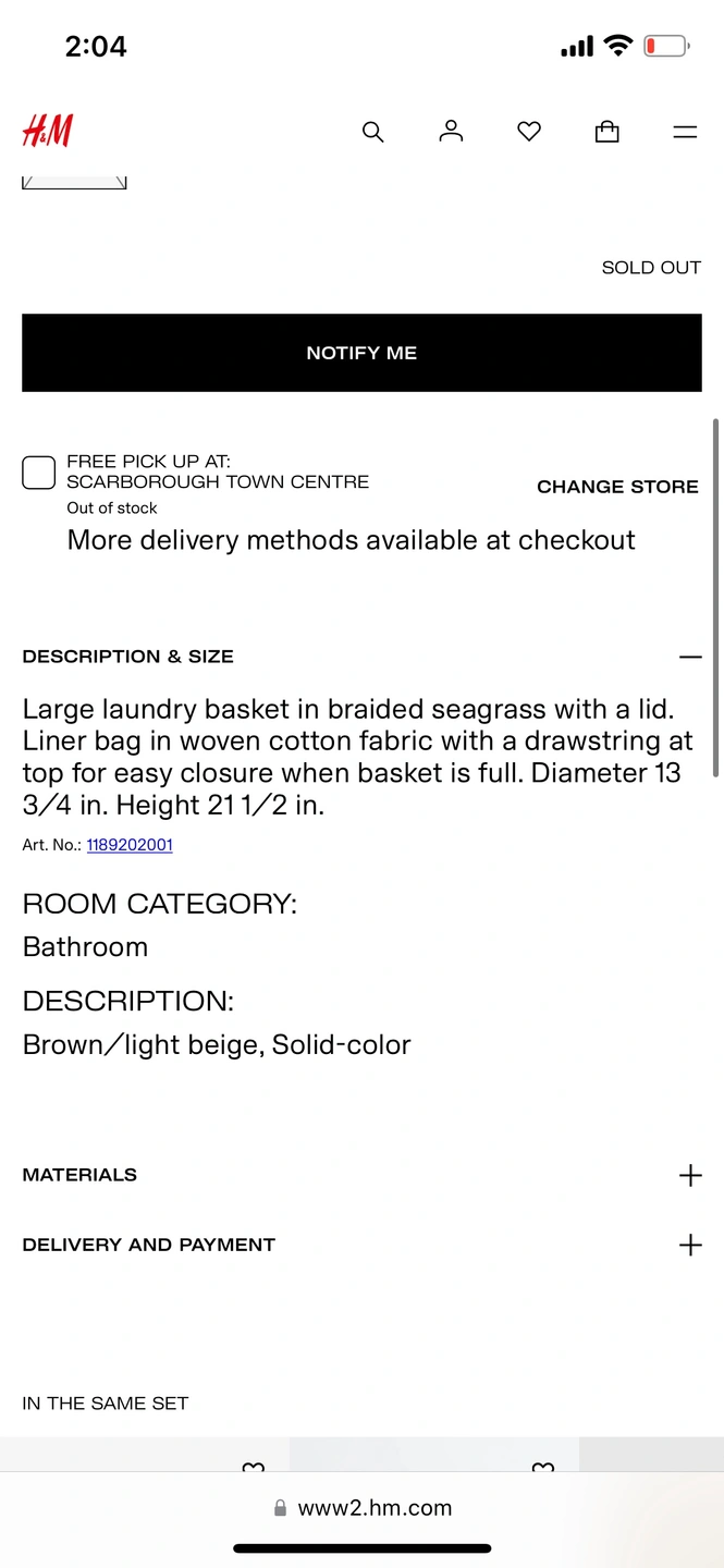 H&M HOME Large laundry basket in braided seagrass with a lid. Liner bag in woven cotton fabric with a drawstring at top for easy closure when basket is full. Diameter 13 3/4 in. Height 21 1/2 in. Original price - 76.99$ + tax. Bought 2 years ago. You can check the H&M listing here: https://www2.hm.com/en_ca/productpage.1189202001.html