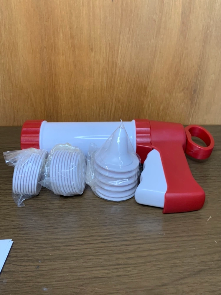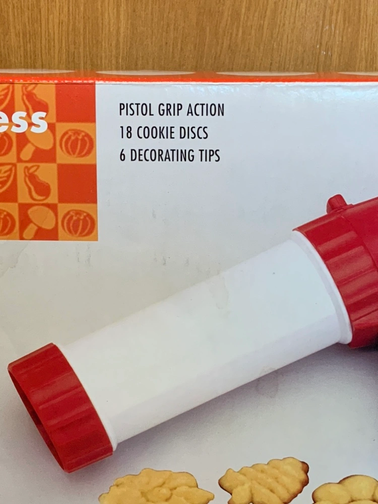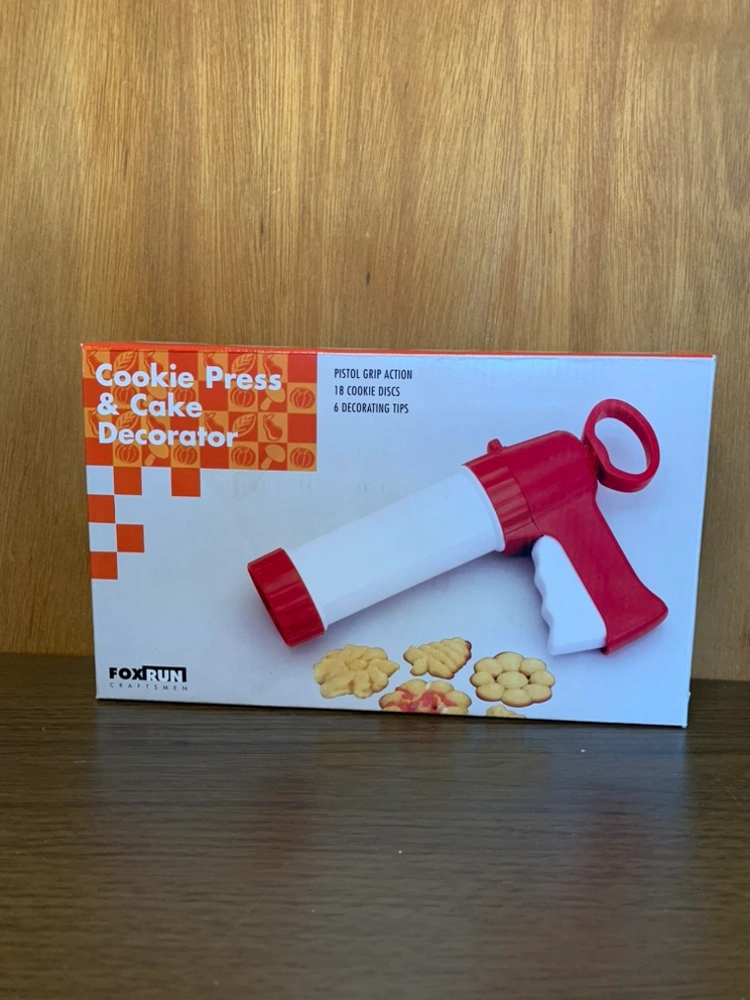 Fox Run cookie press and cake decorator. Includes 18 cookie discs and 6 decorating tips. Features a pistol grip action.
