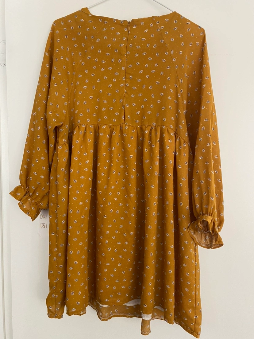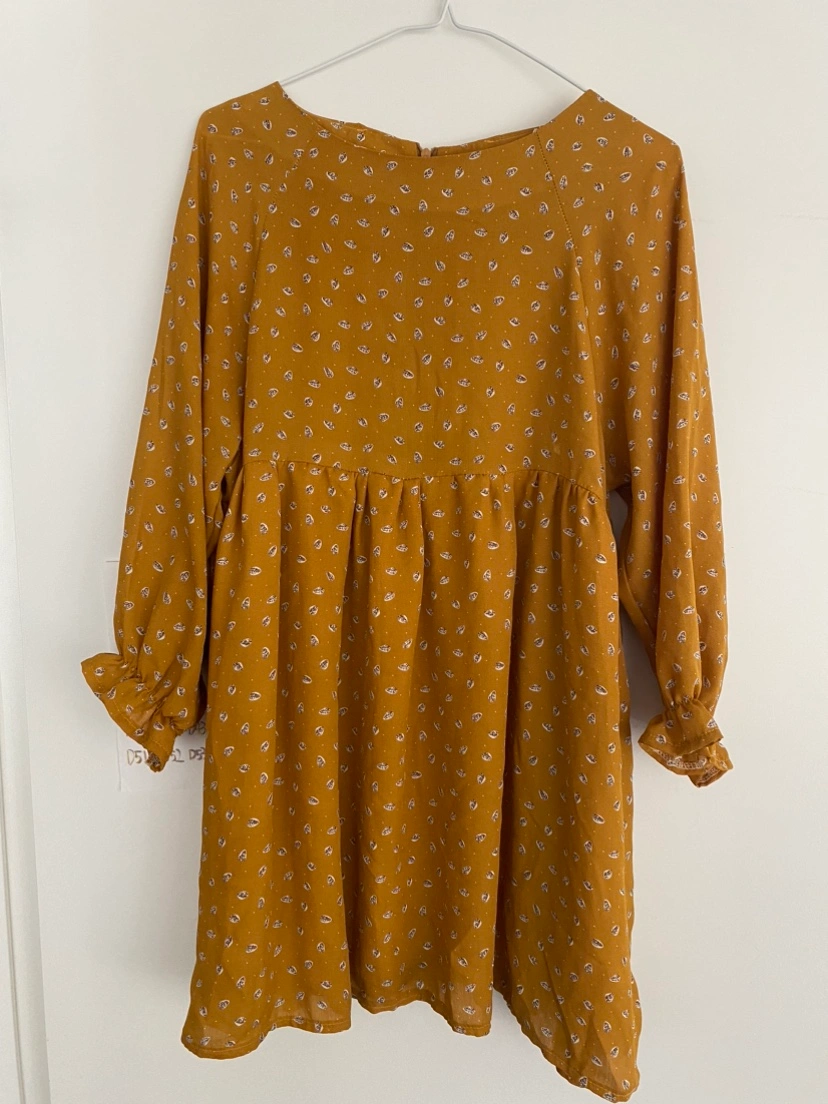 A mustard yellow mini dress with a white floral print. The dress has a gathered skirt and long sleeves with ruffles at the cuffs. The neckline is a round neck. It is a lightweight fabric and perfect for spring or summer.