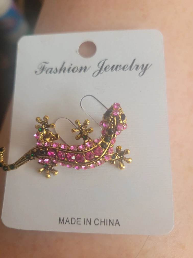 Gold-toned brooch with pink rhinestones and a green tail. It features a lizard design and is perfect for adding a touch of sparkle to your outfit.