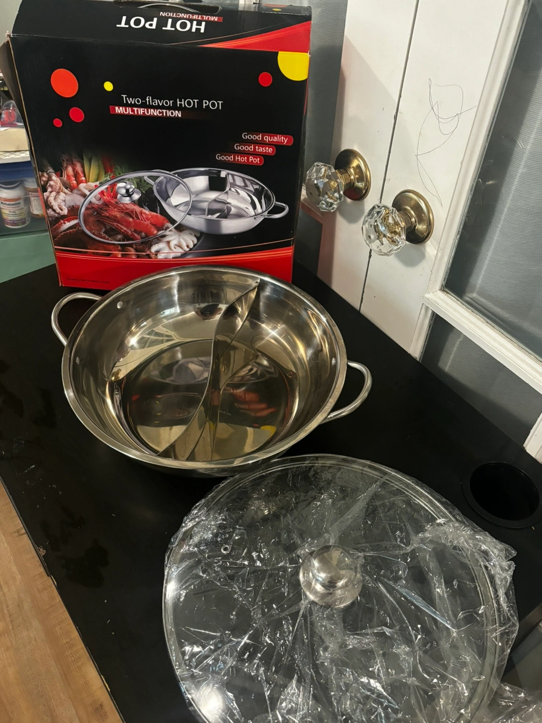 Stainless steel hot pot with glass lid. The hot pot has a divider that creates two flavour compartments. It also has two side handles. Comes with a glass lid. Great for hot pot, fondue, and more.
