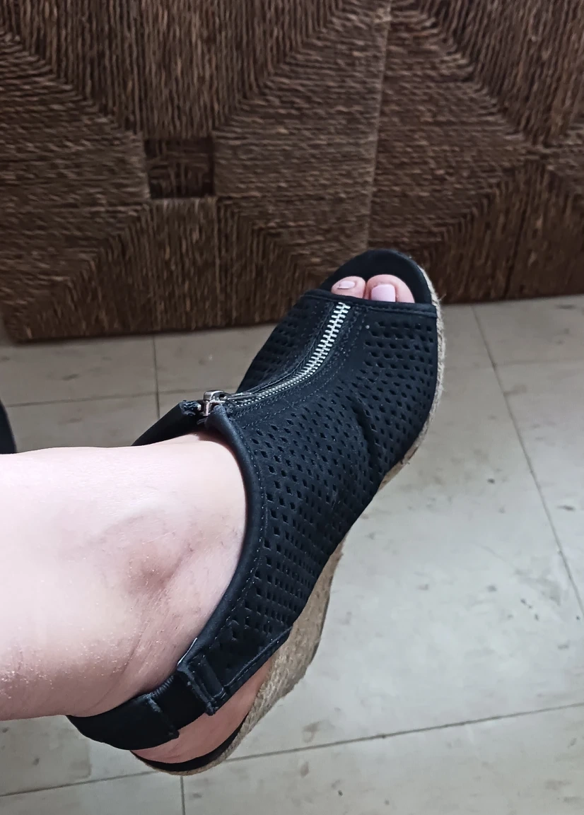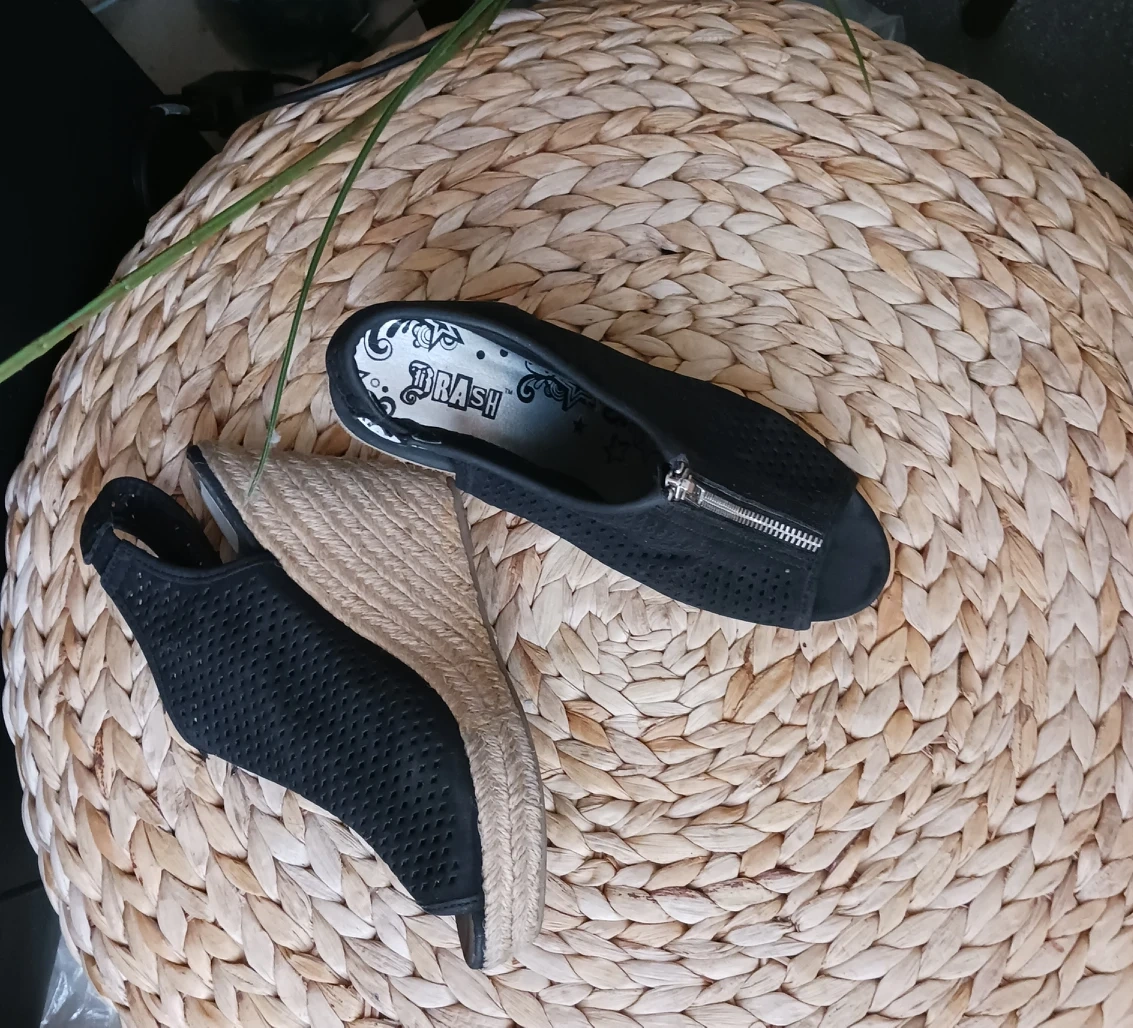 The perfect summer/ fall boot. Half-boot/ Shoety. Perforated soft upper means cool wear for summer, cozy for fall. Zipper detail for that edgy look. 3.5" wedge espadrille platform heel allowed me to run around! Instantly elevates even the most boring outfit! Pre-loved. Size 7.