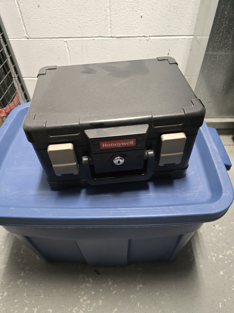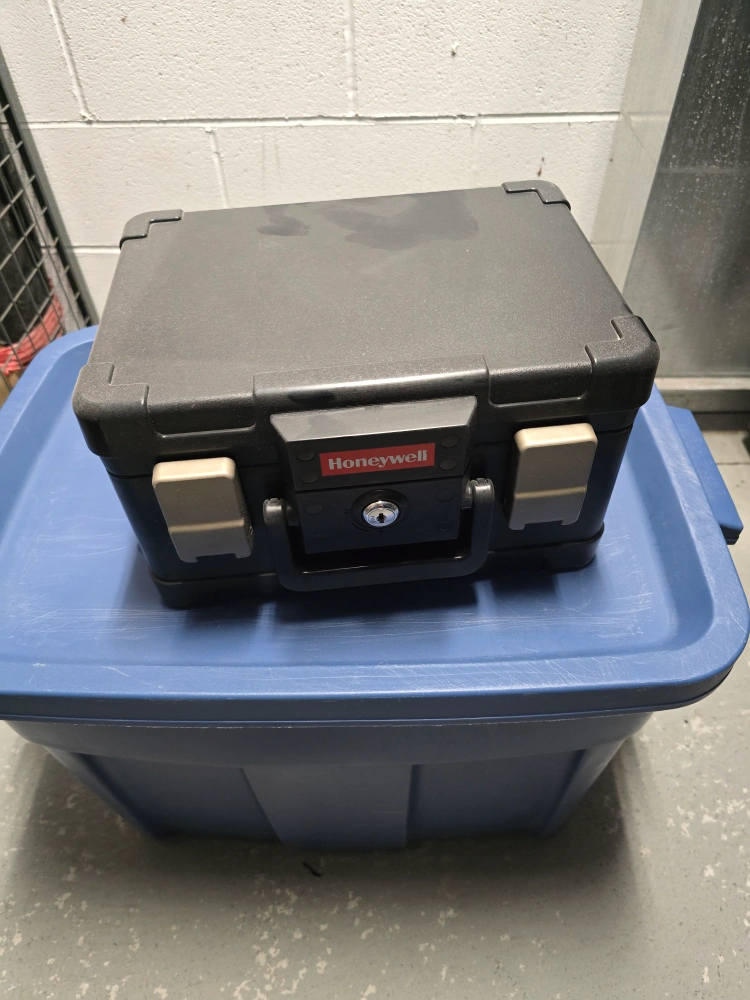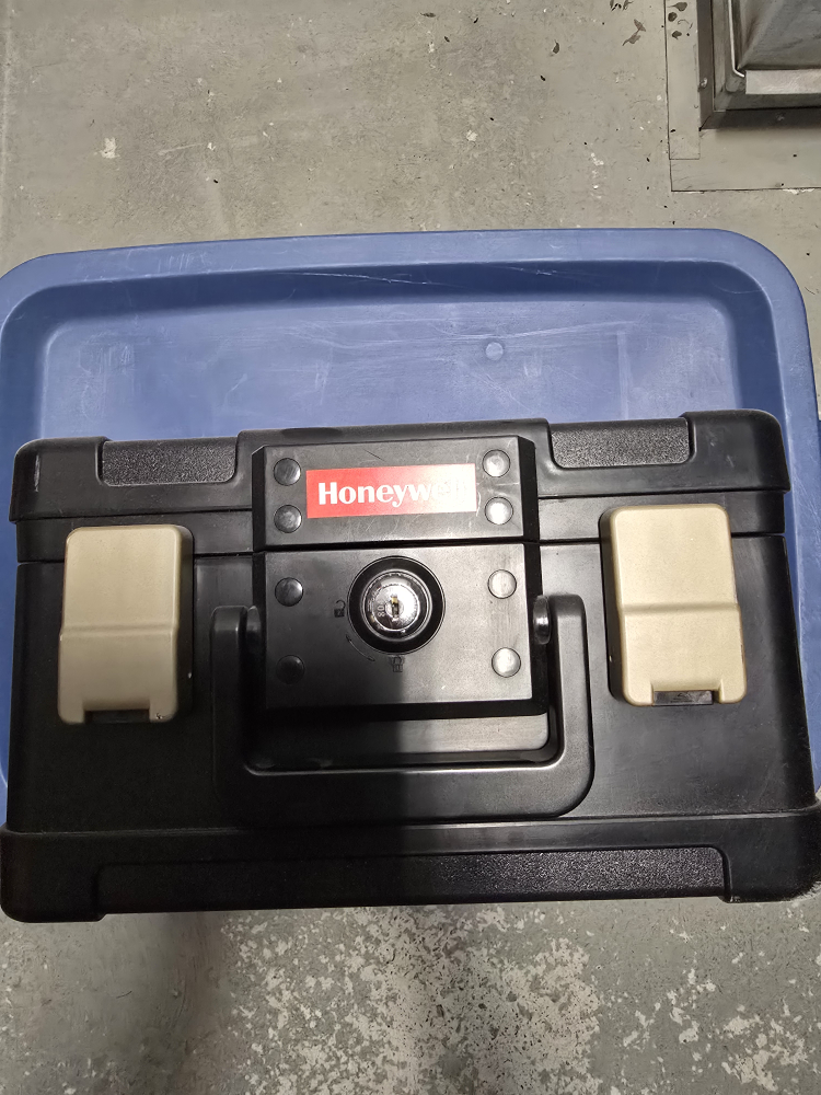 Small safe with combination lock. Good for keeping small valuables safe. Included the key