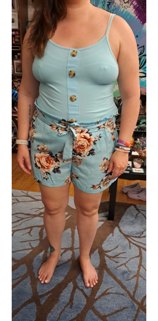 Light blue shorts with a floral pattern, elastic waist with a tie, and pockets on the sides. Comes with a light blue tank top with buttons on the front.