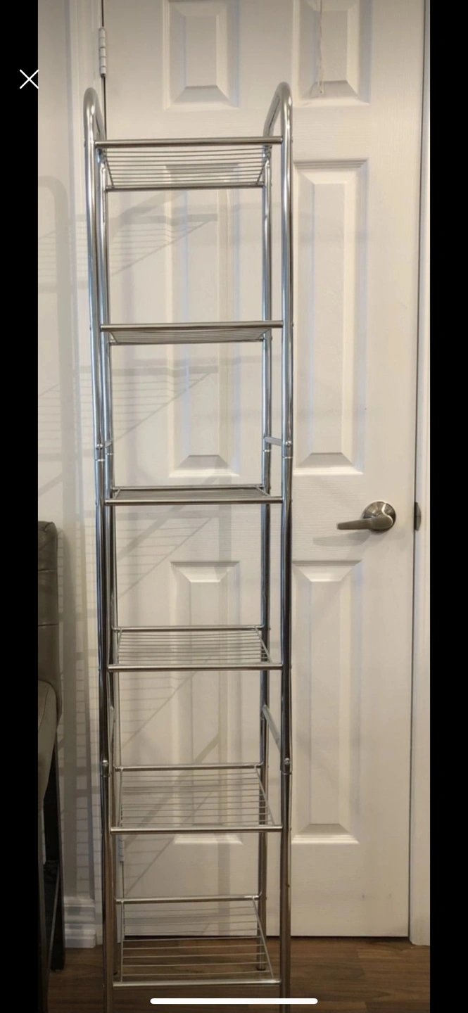 This shelving unit has six(6) tiers and is made of chrome. It is great for organizing and storing items in a variety of spaces. …sturdy & Light to carry.