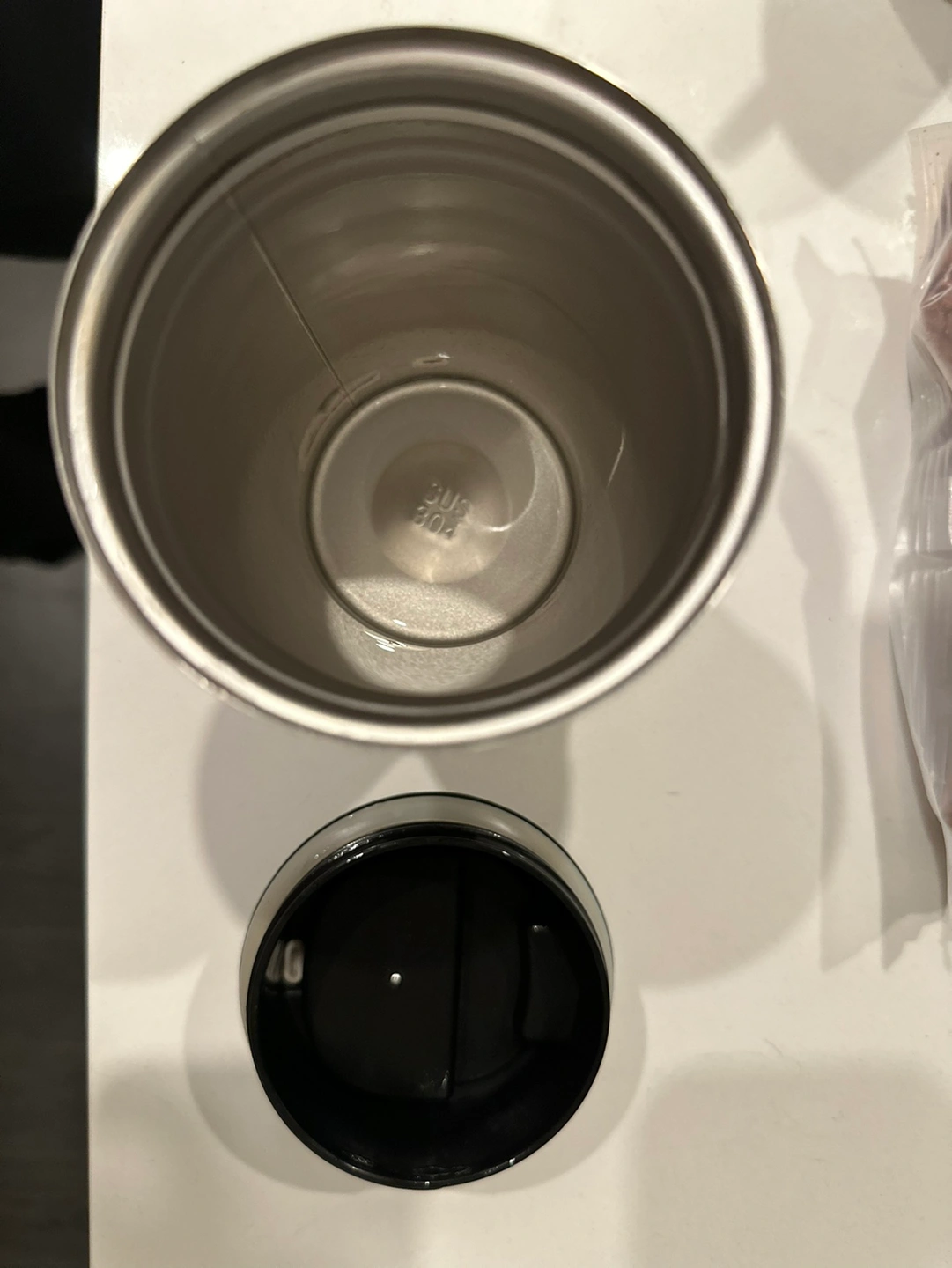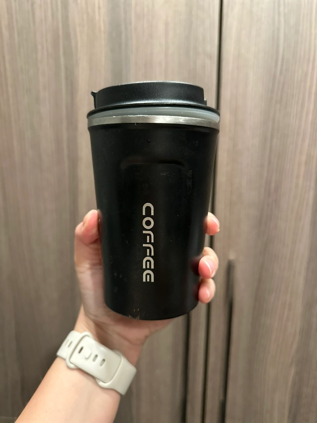 Black travel mug with a temperature gauge lid. The mug is stainless steel and has a capacity of 300 ml.