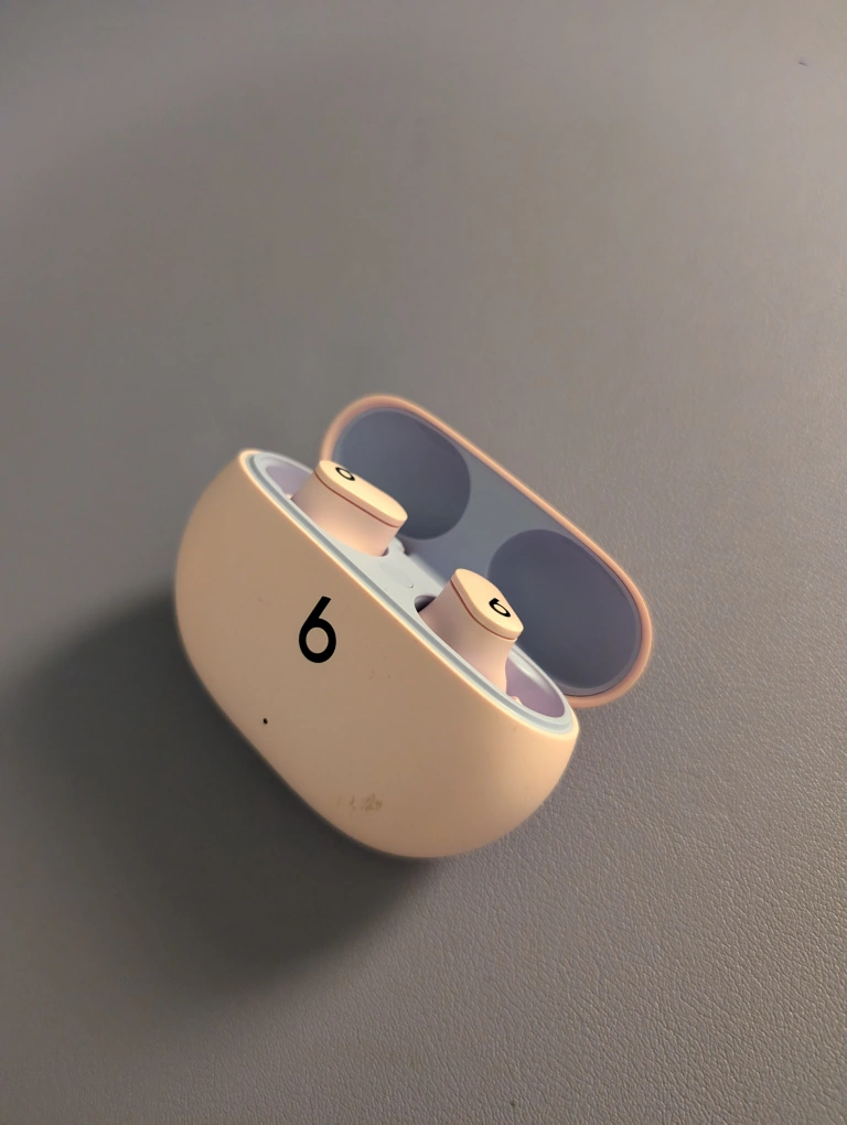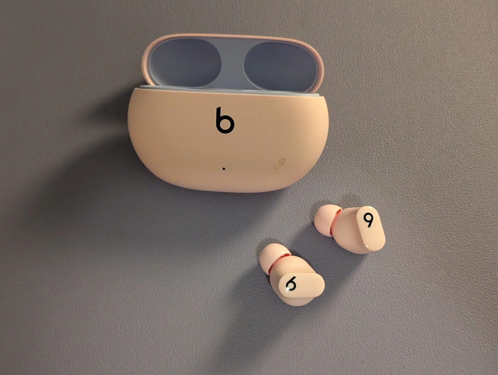 Pink wireless earbuds, come with charging case.