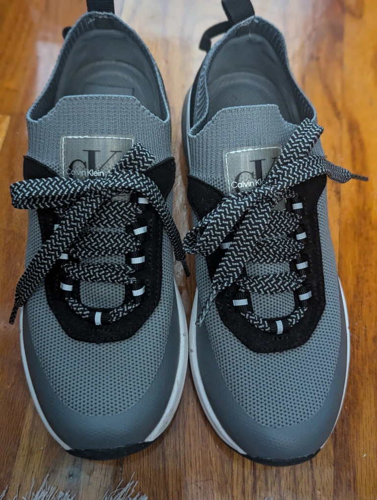 Grey and black knit sneakers with black laces. Condition like new . Worn exactly once. Accidentally bought the wrong size and did realize till later.