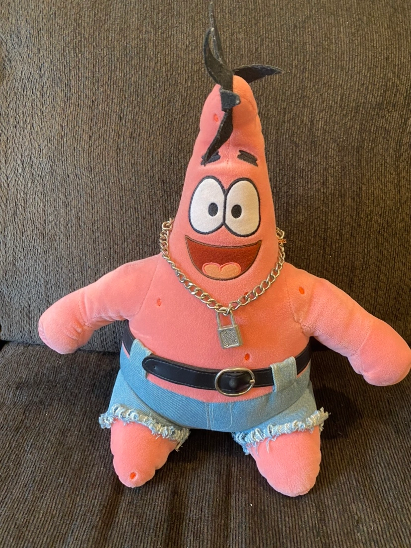 2005 rare large biker Patrick Star plush wearing a silver chain and padlock necklace and denim shorts. Measures around 14” tall x 6 - 8” wide.