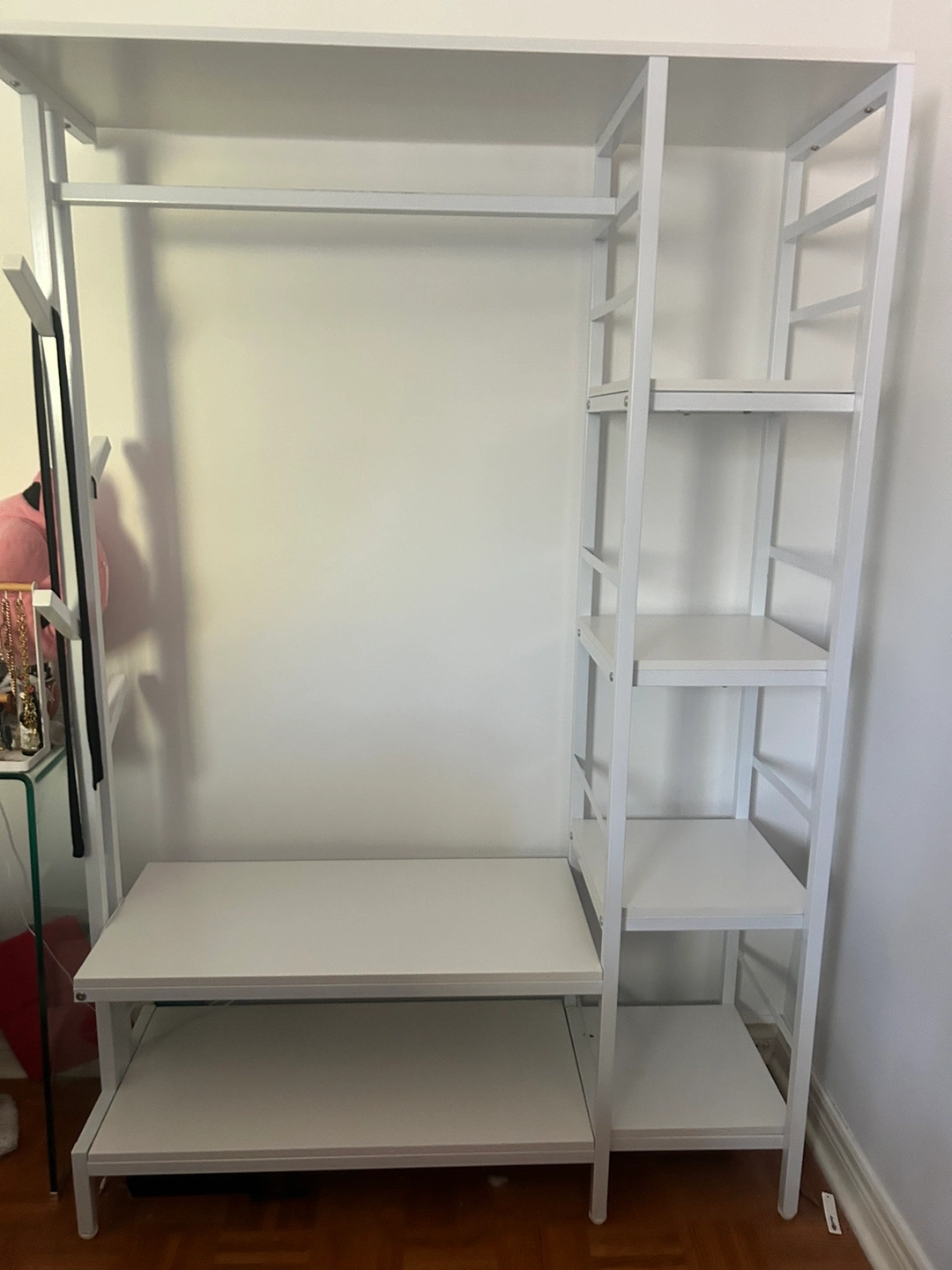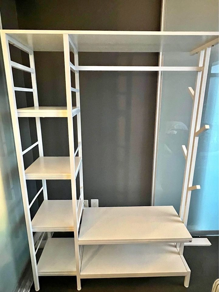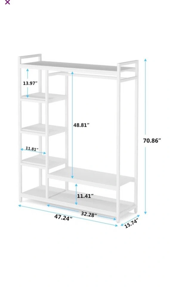 White closet system with shelves, a hanging rod, and a lower shelf. It measures 47.24" wide x 70.86" tall x 32.28" deep.