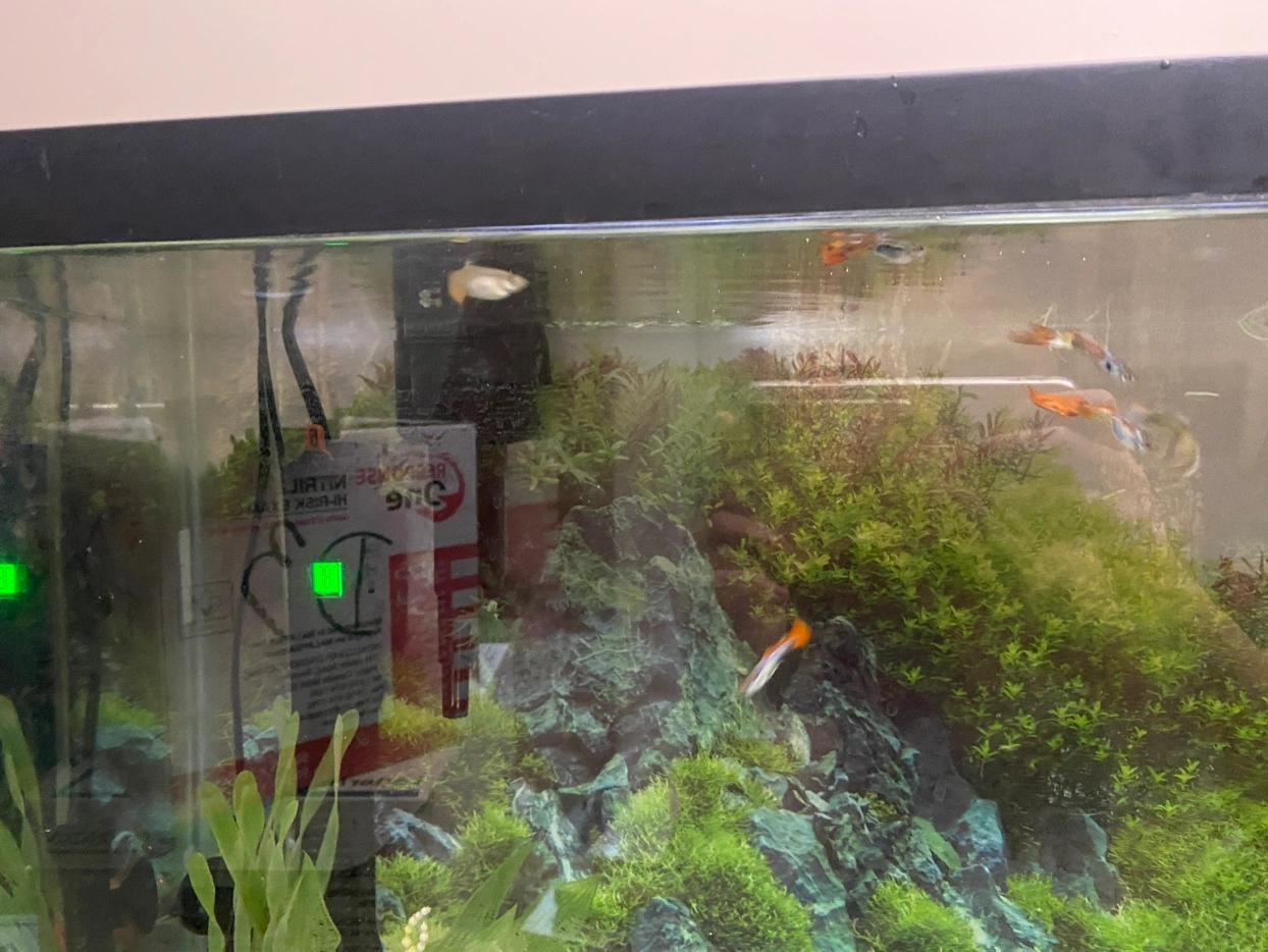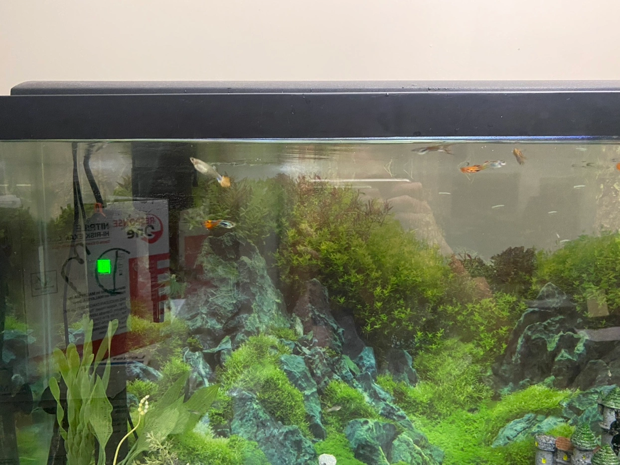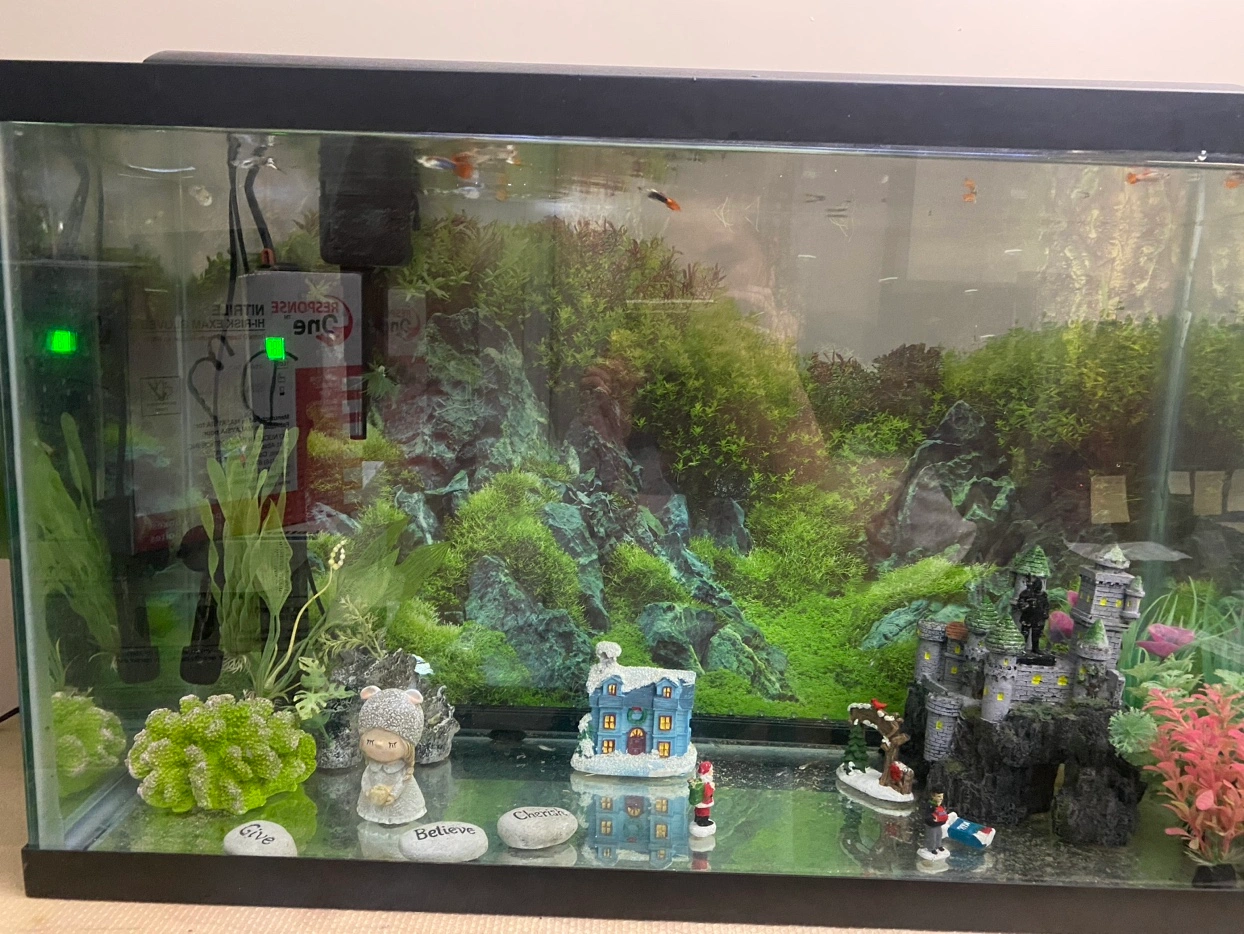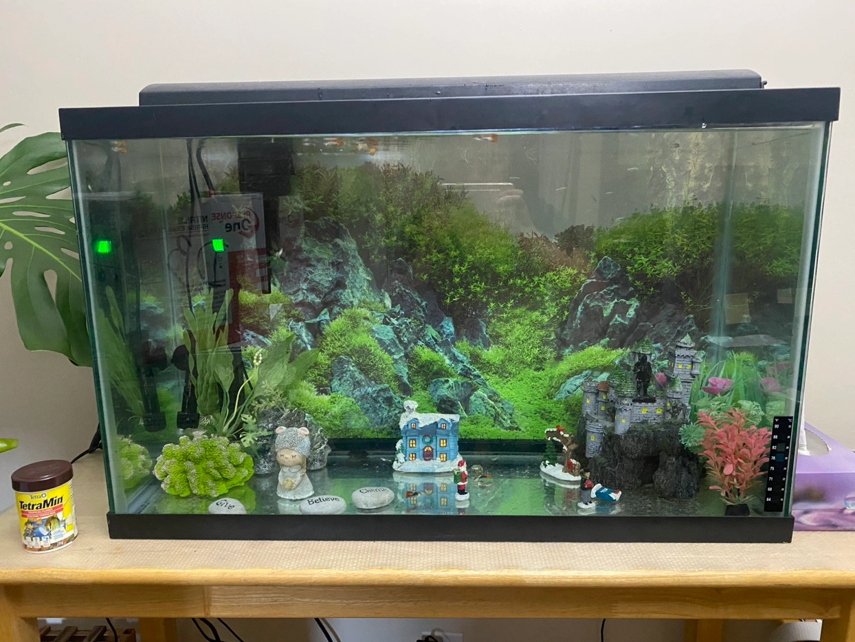 This is a 32-gallon aquarium with a filter, heater, and decorations.