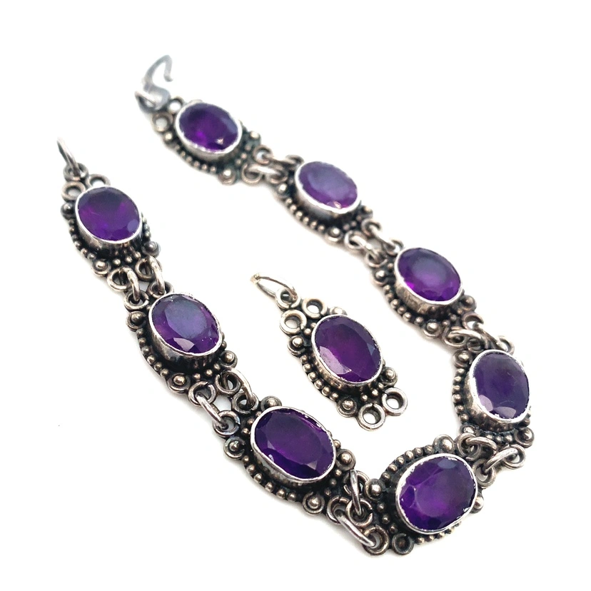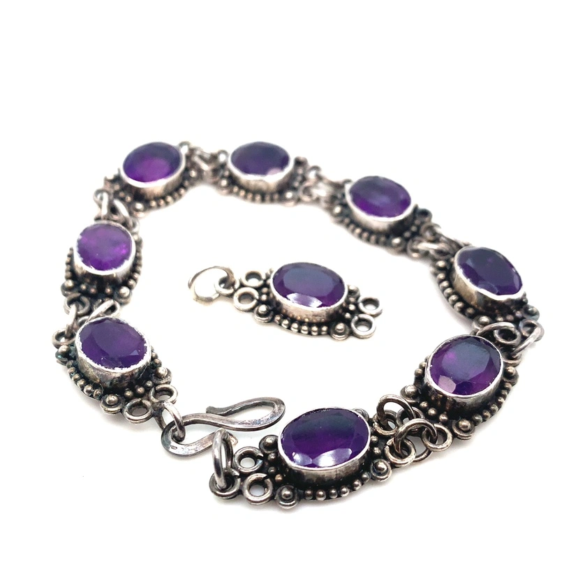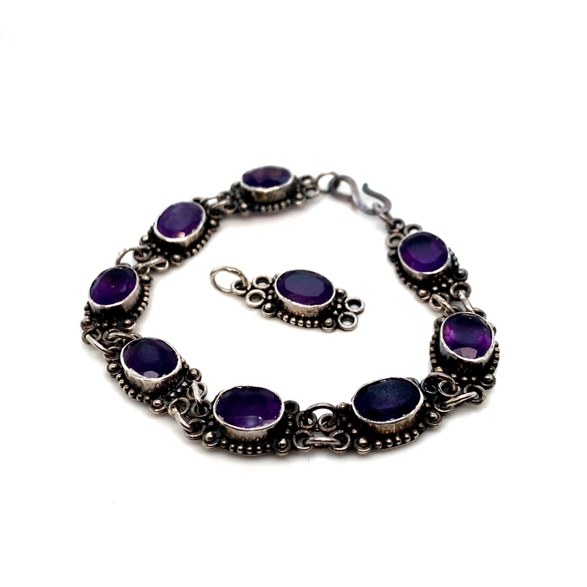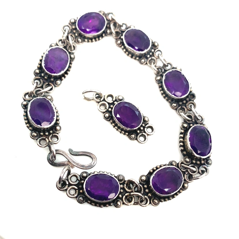 A Sterling silver bracelet with eight oval amethysts and a matching pendant. The bracelet is approximately 7 inches long and the amethysts are 9.5 mm by 7.5 mm. I can throw in a chain if you want one but price is definitely firm as I paid $300 for it