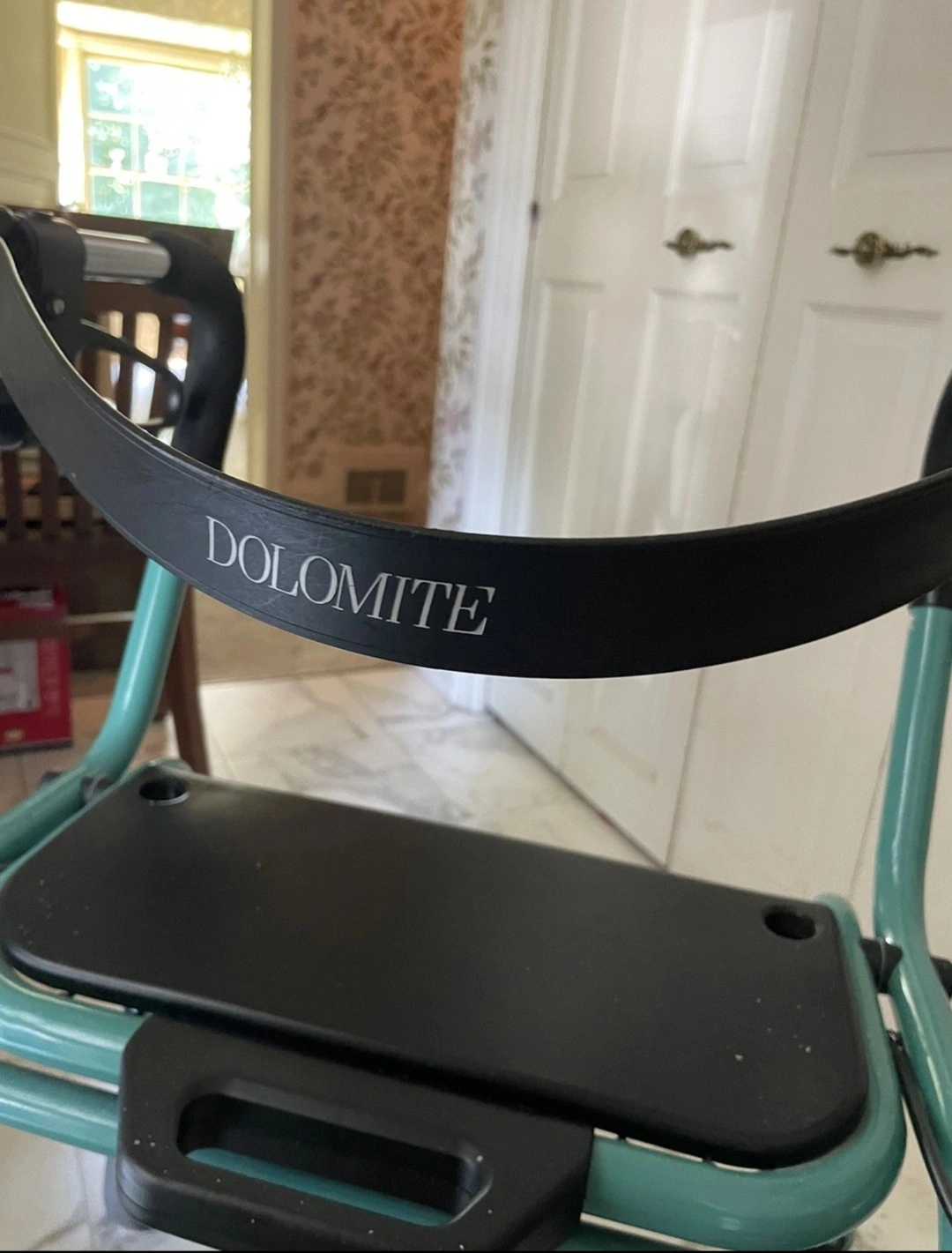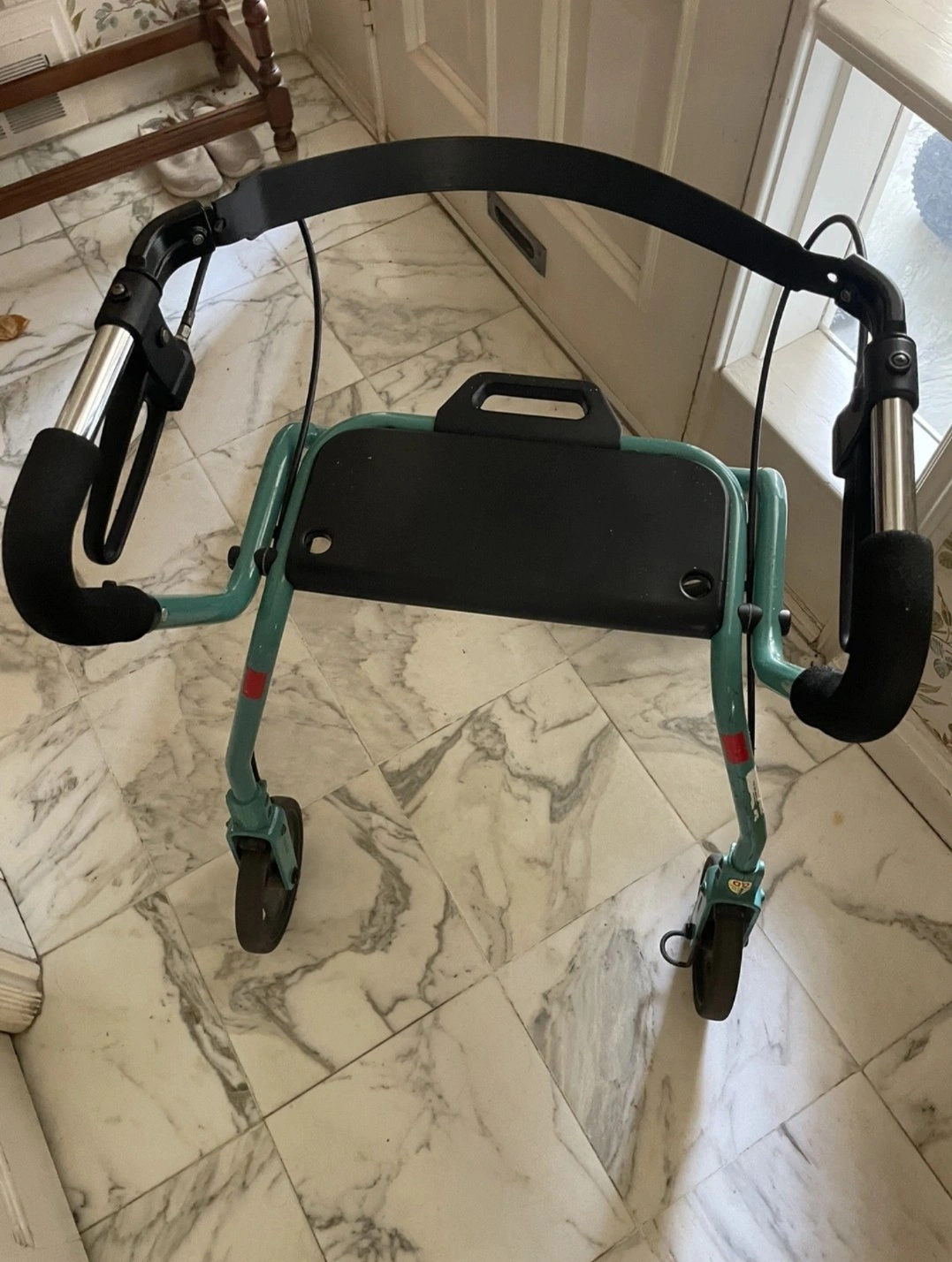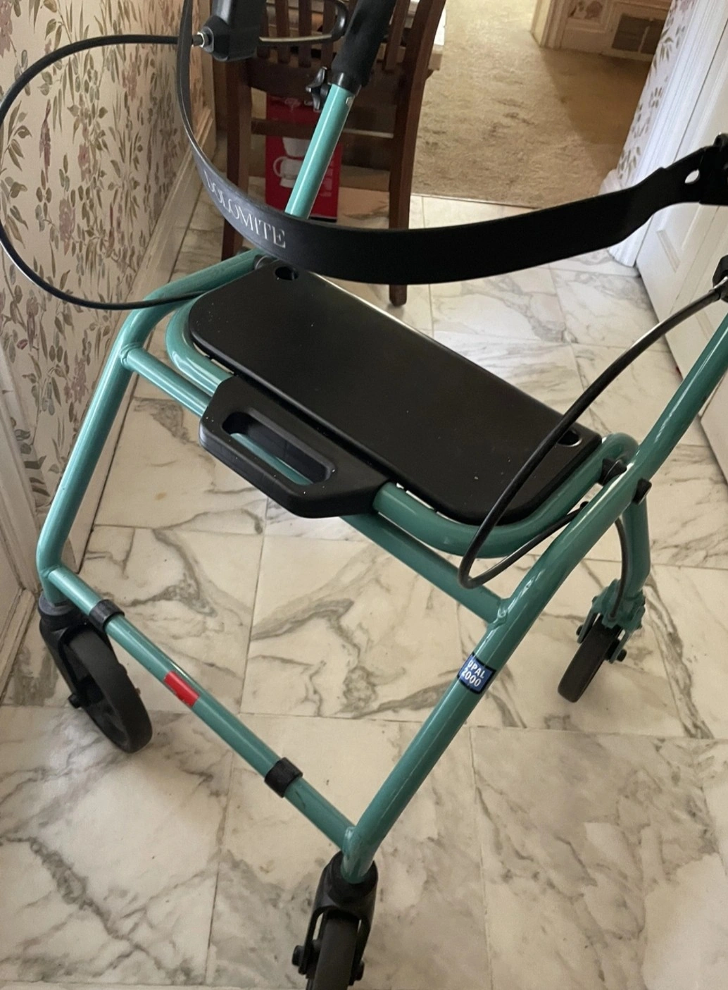 Teal coloured 2nd hand walker with black seat and black wheels.This Dolomite brand walker folds for storage and comes with a seat. It has a black seat and teal frame. It has a strap around the back for added support. The wheels are in good condition. It is a very sturdy walker. It is in good condition.
