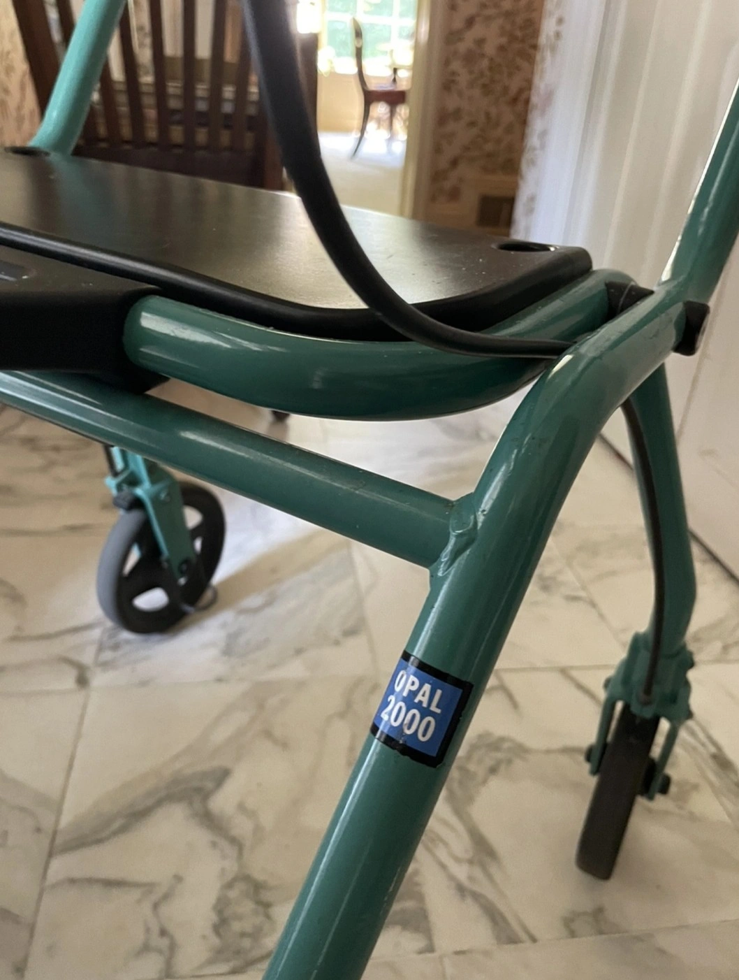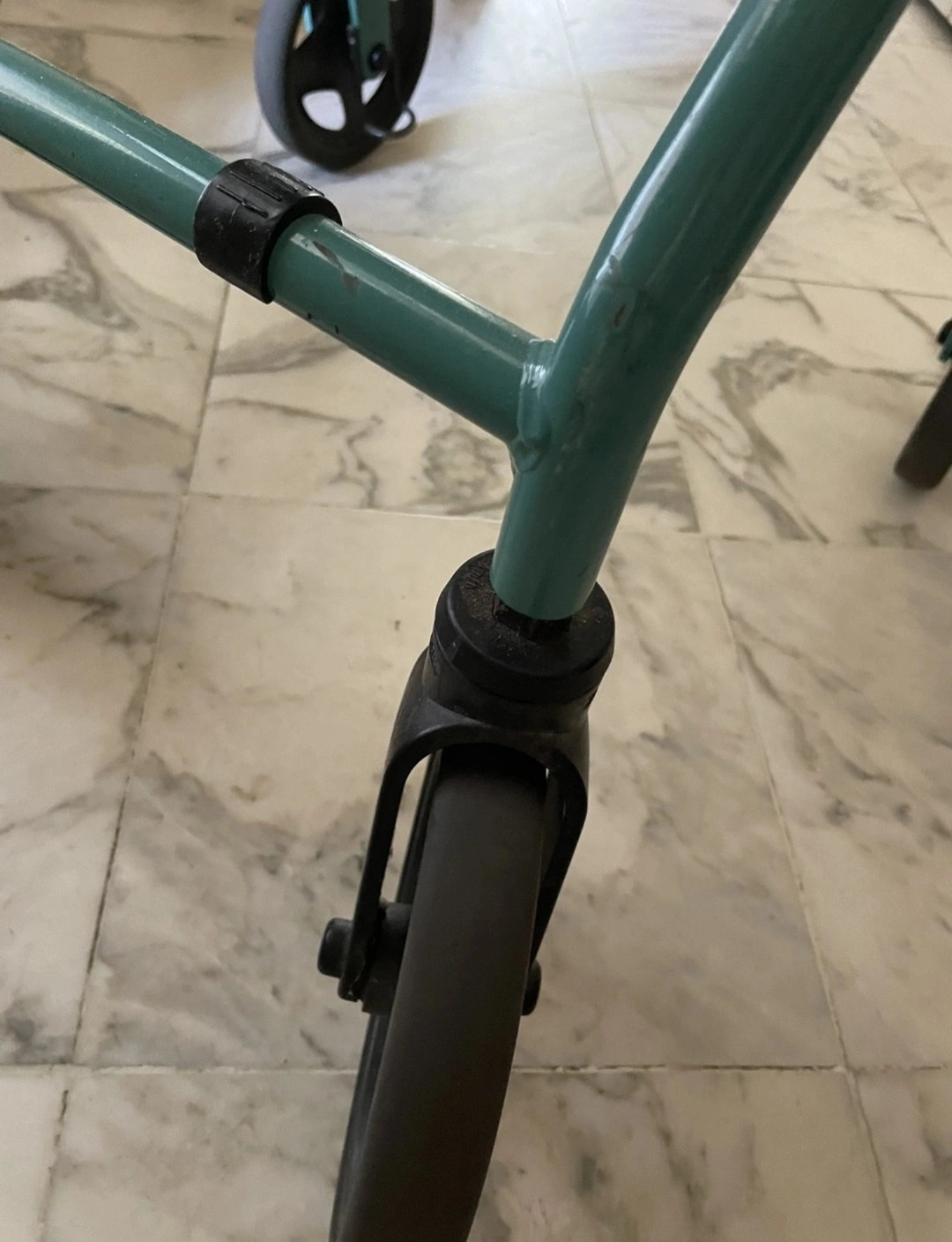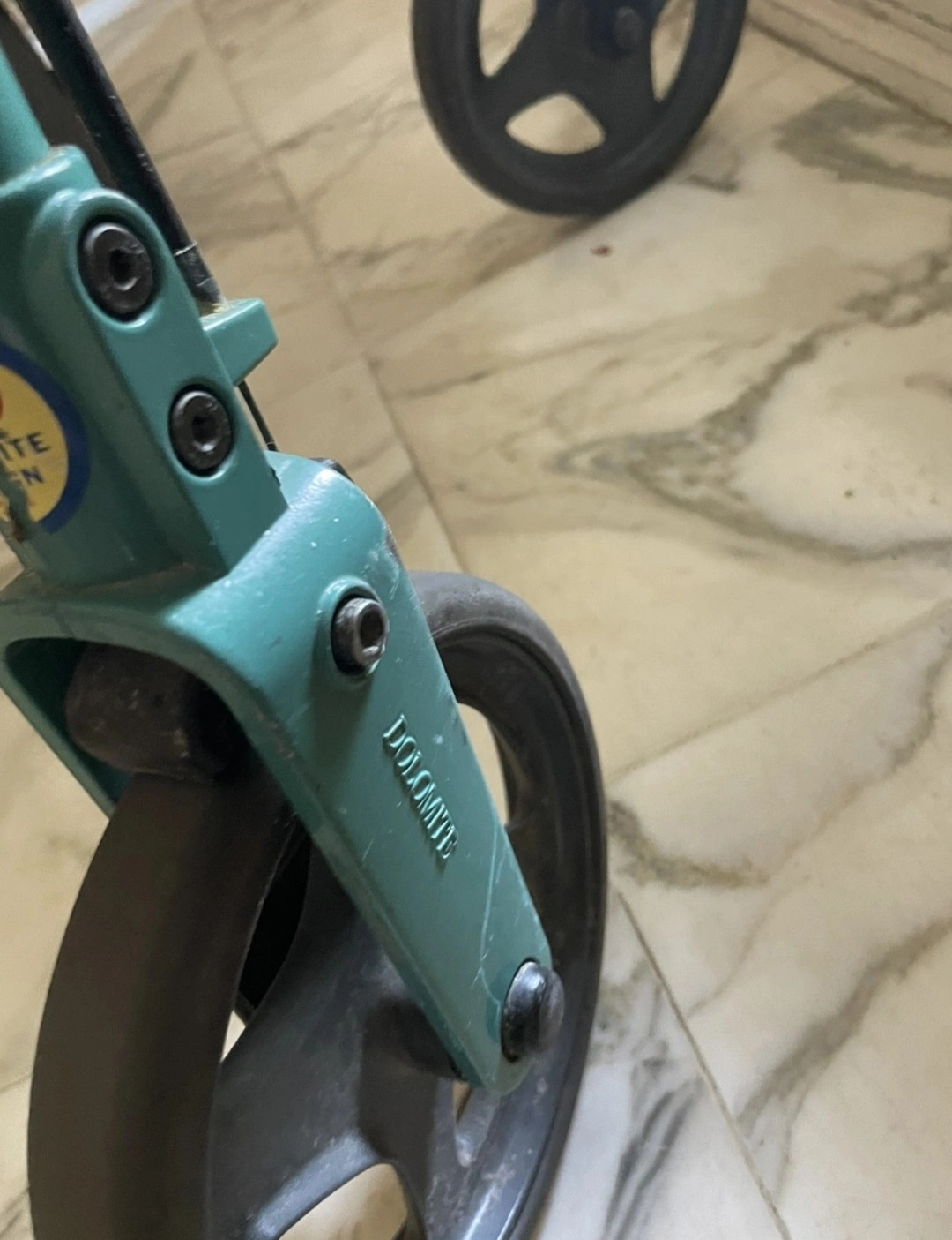 Teal coloured 2nd hand walker with black seat and black wheels.This Dolomite brand walker folds for storage and comes with a seat. It has a black seat and teal frame. It has a strap around the back for added support. The wheels are in good condition. It is a very sturdy walker. It is in good condition.