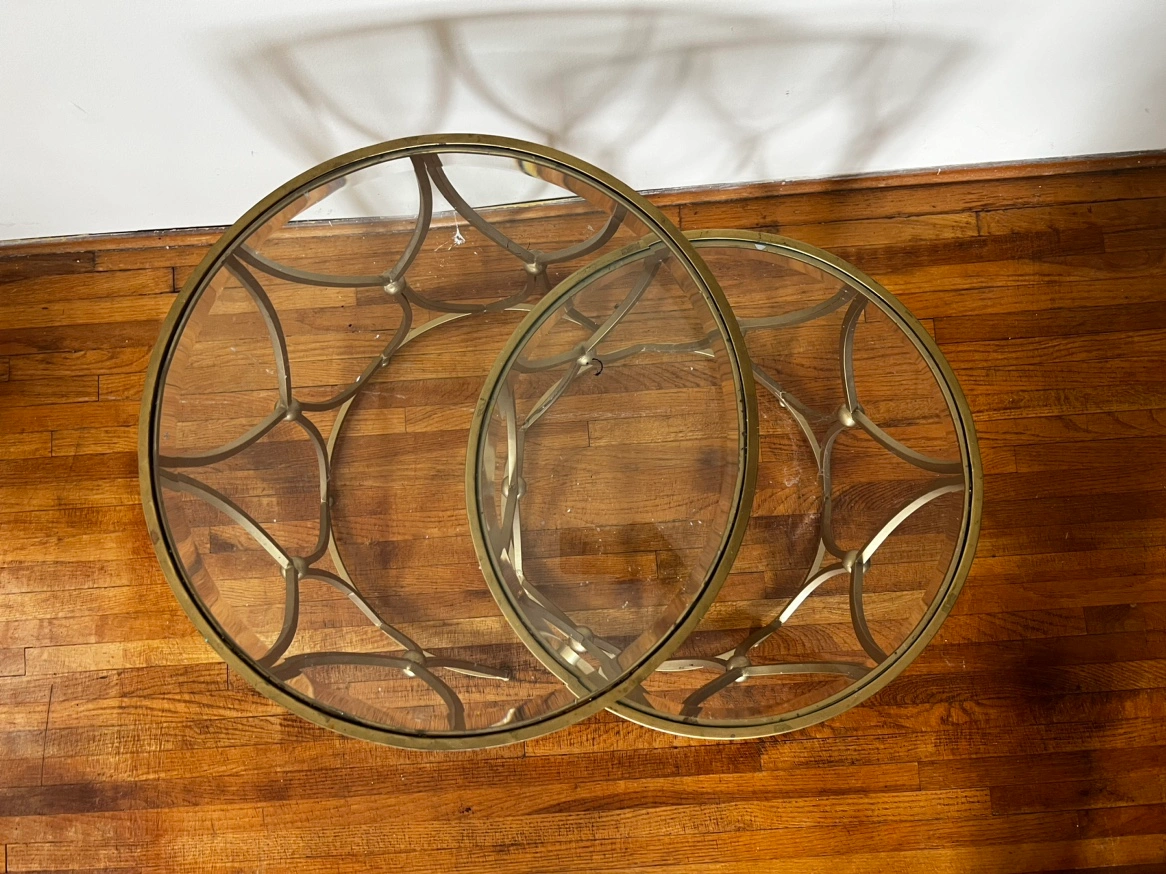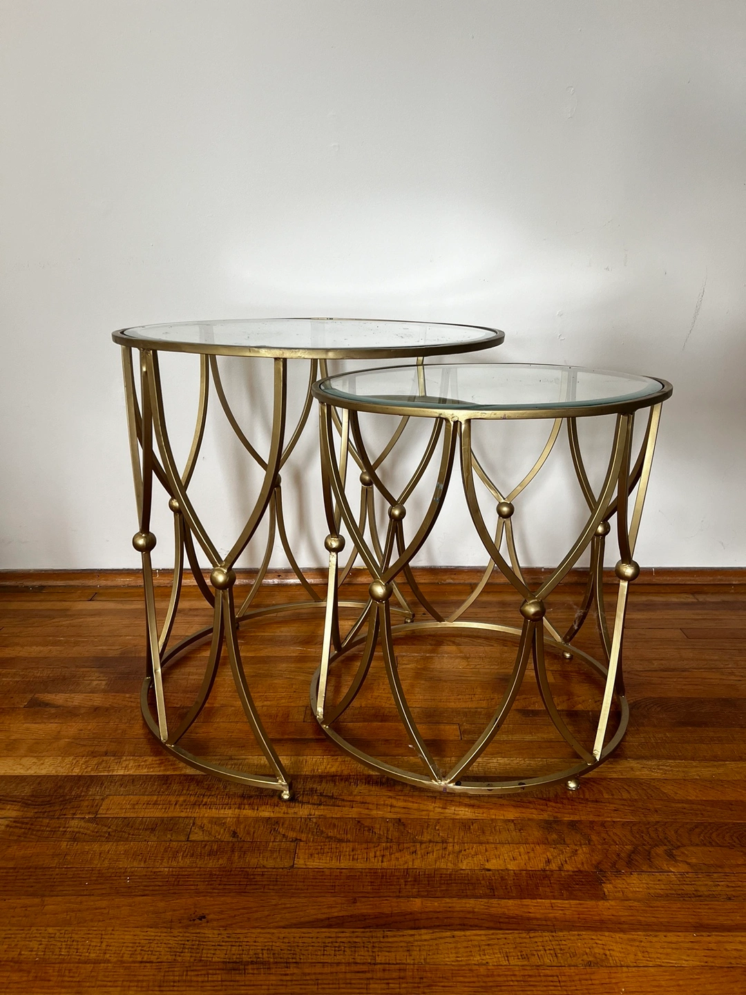 A set of two nesting tables with a round glass top and a gold metal frame. The smaller table fits perfectly inside the larger table. They are perfect for a modern or contemporary home.