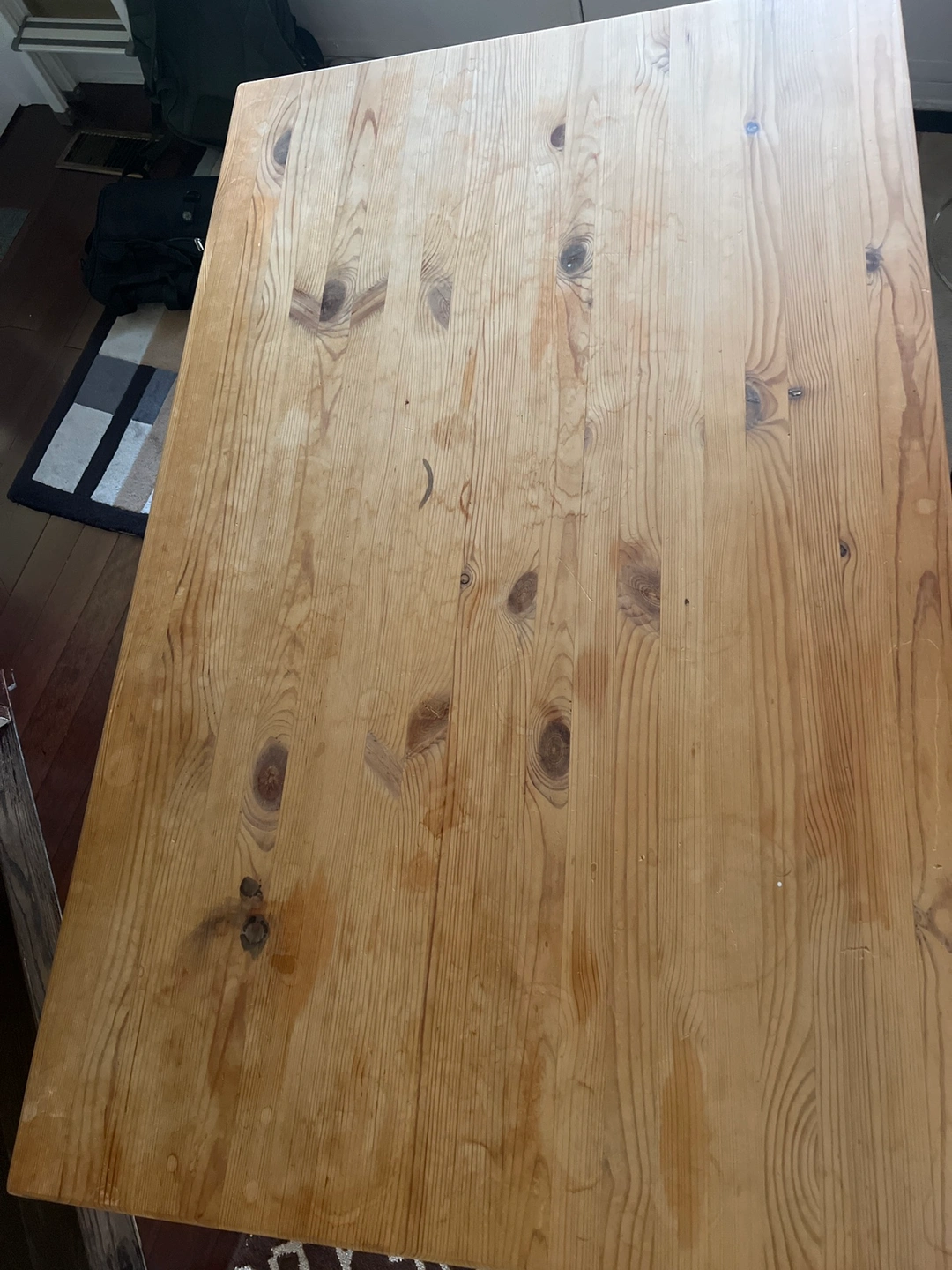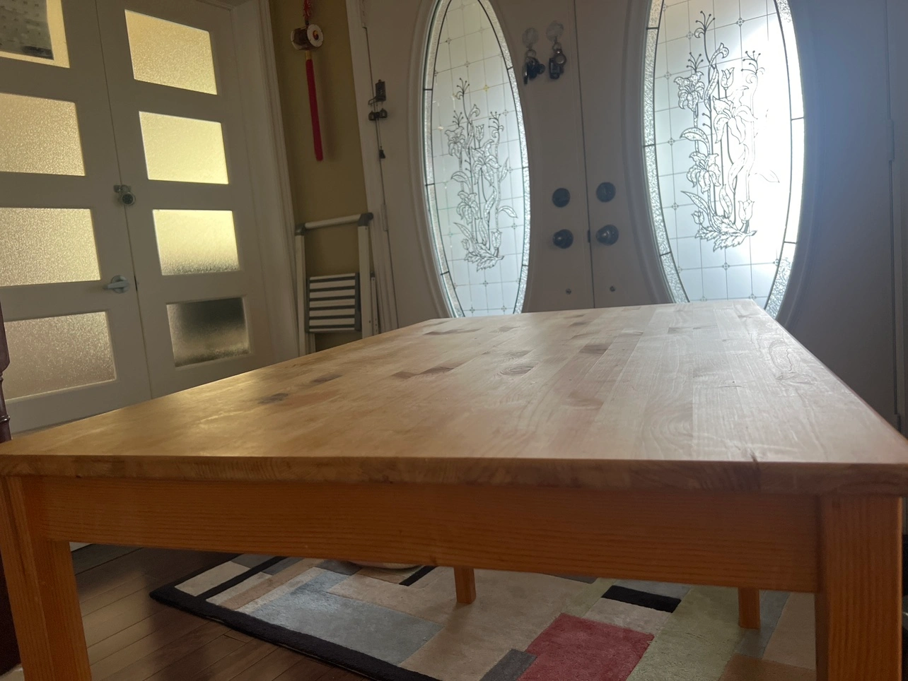 Solid wood table with four legs. The table is a good size for a small dining room or kitchen. It is made of a solid, natural wood. The table is easy to assemble and disassemble. The table top is a smooth surface, but it does have some scratches.