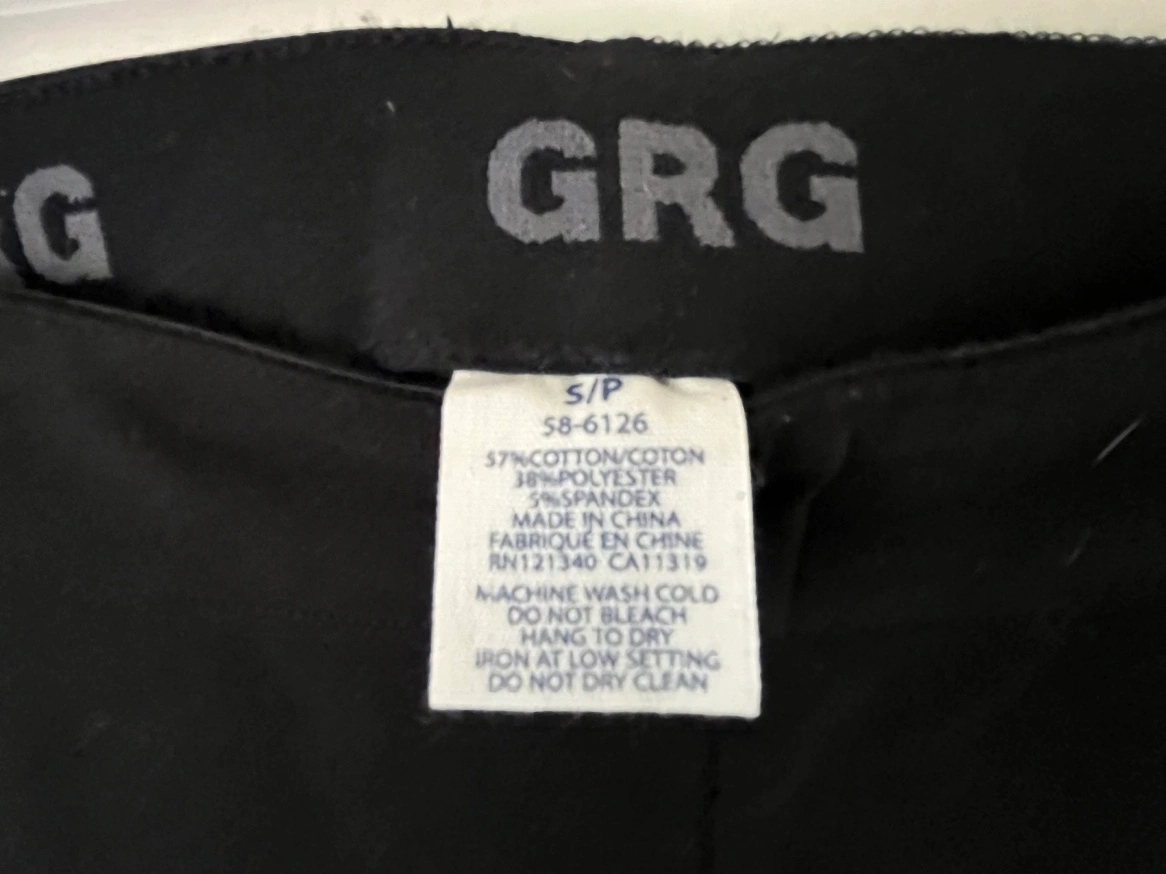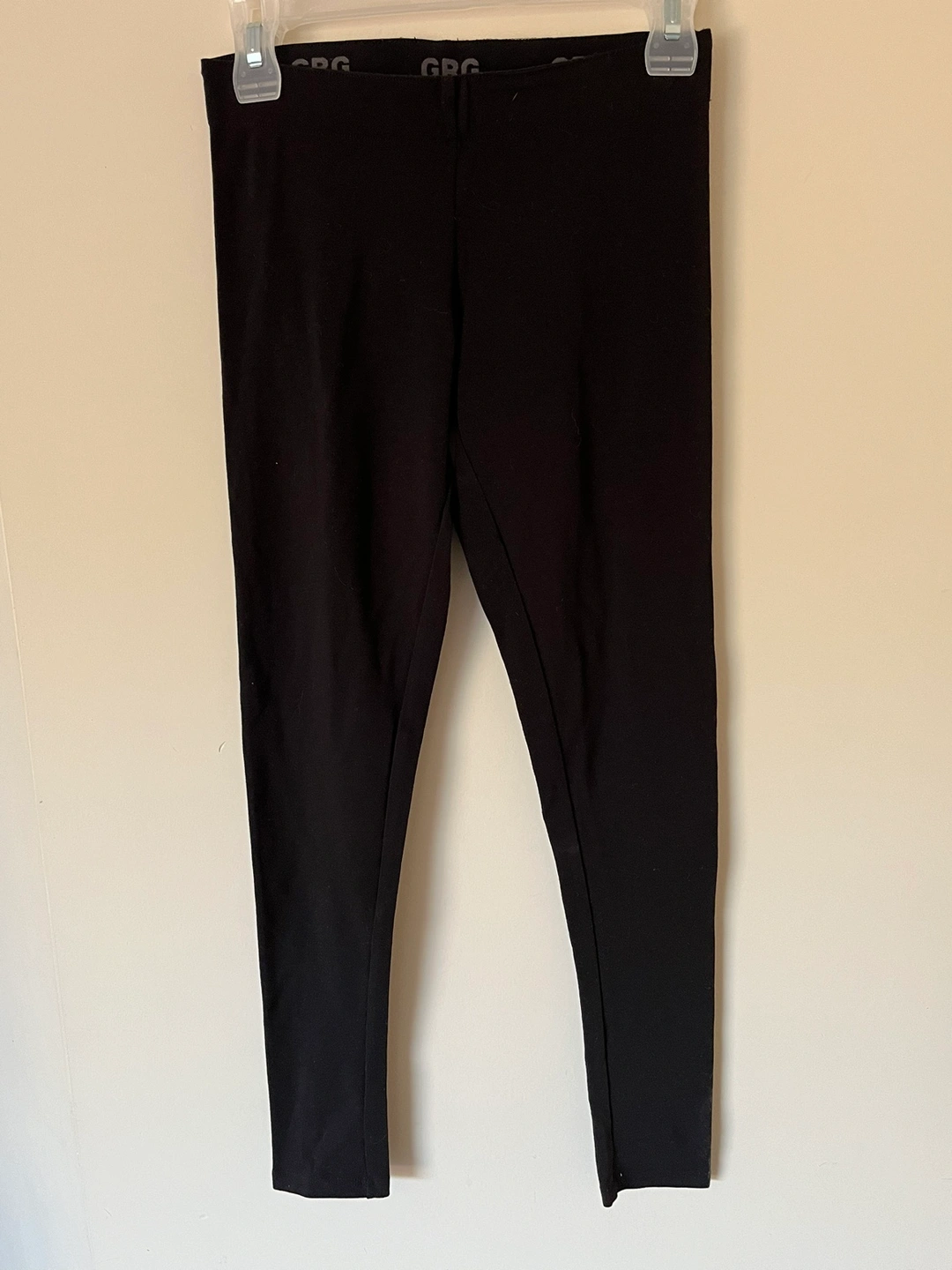 New black leggings with the GRG brand logo. Made of 57% cotton, 38% polyester, 5% spandex. Machine washable. Size S & XS available.