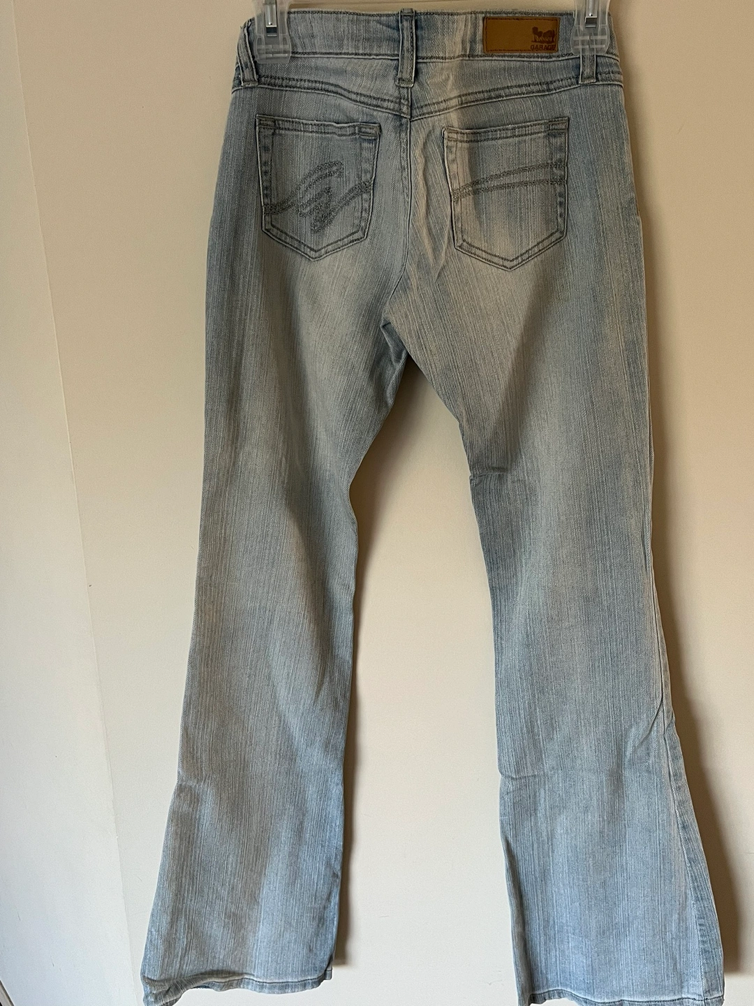 New Garage light blue washed denim. Size 00. These jeans have a relaxed fit with a flared hem. They feature a classic five-pocket design and a zip fly closure. 98% cotton and 2% spandex.