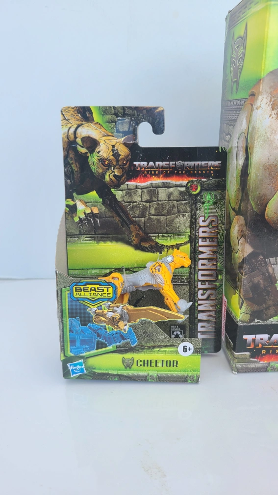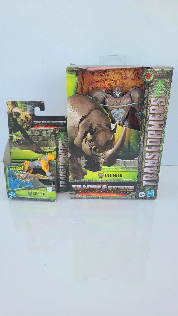 Transformers Rise of the Beasts figures, Cheetor and Rhinox. Both figures are in new, unopened packaging.