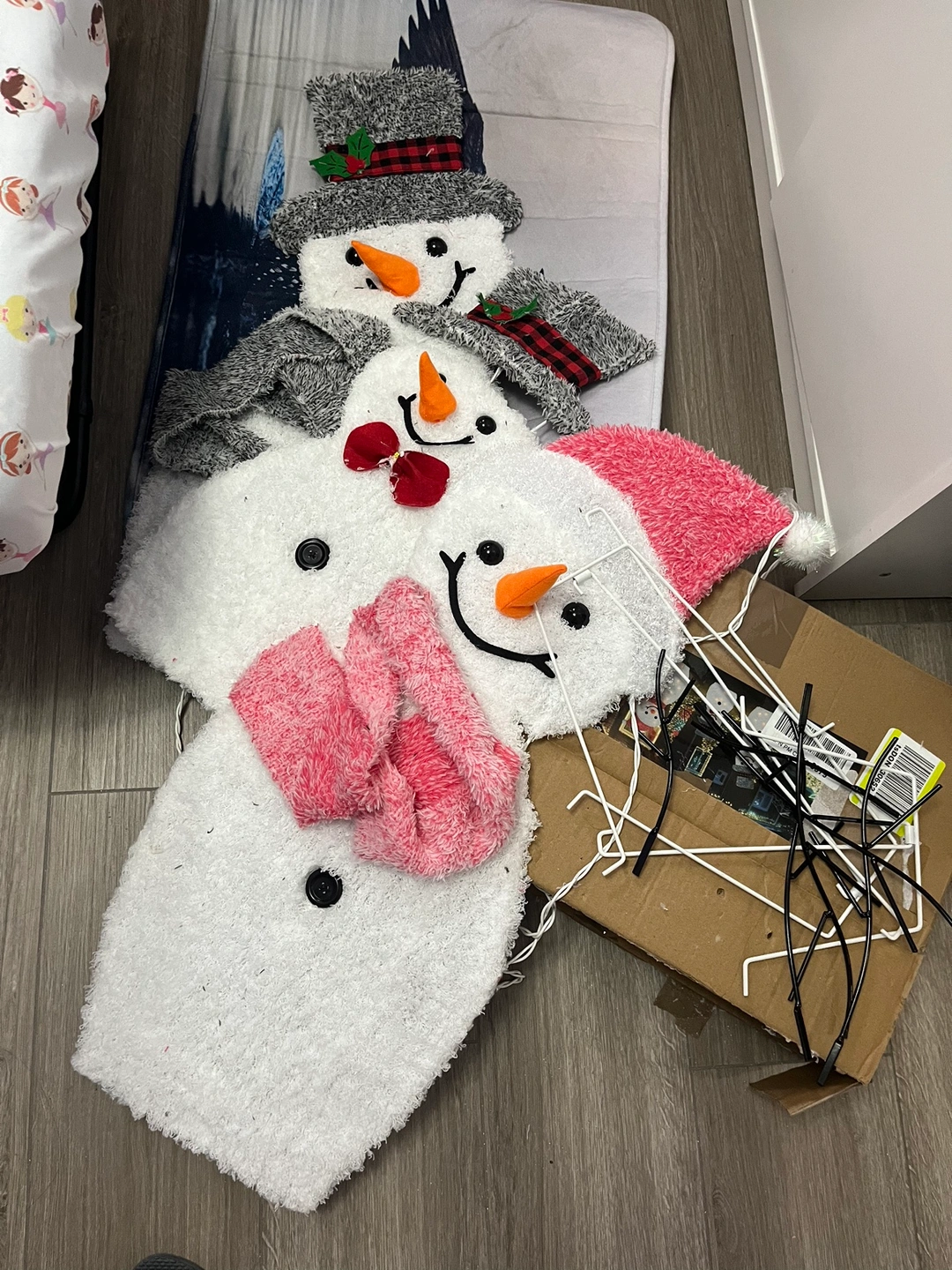 This is a lighted snowman family Christmas decoration in the shape of a family of three snowmen. Dimensions: Large is 30x12.5, Medium is 28.5x12.5 inches and Small is 21x10 inches. Plug in