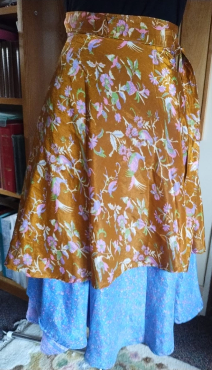This is a silk 2-layer wrap skirt with a floral print on one side and a blue print on the other side. It can be worn in a variety of ways.
