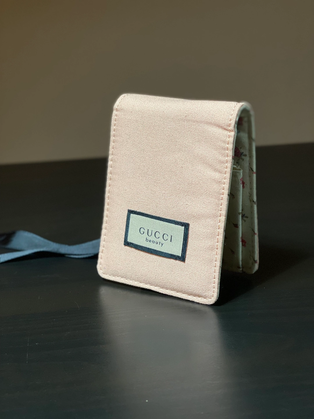 This Gucci Beauty Cosmetics pouch in a soft pink hue is a chic and luxurious accessory for storing your lipsticks. Crafted from high-quality materials, this compact pouch features the iconic Gucci logo on the front. Ideal for holding lipsticks or other small beauty products, this elegant pouch is both functional and stylish—a must-have for any beauty lover.