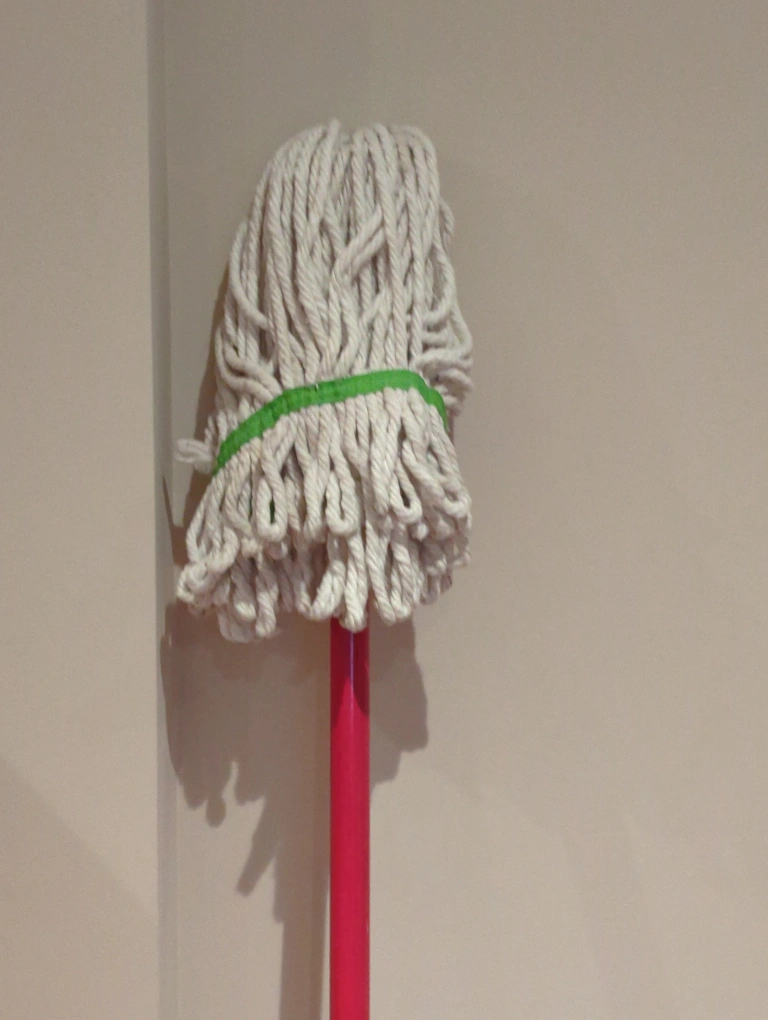 A mop with a red handle. The mop head is attached to the handle with a green band.