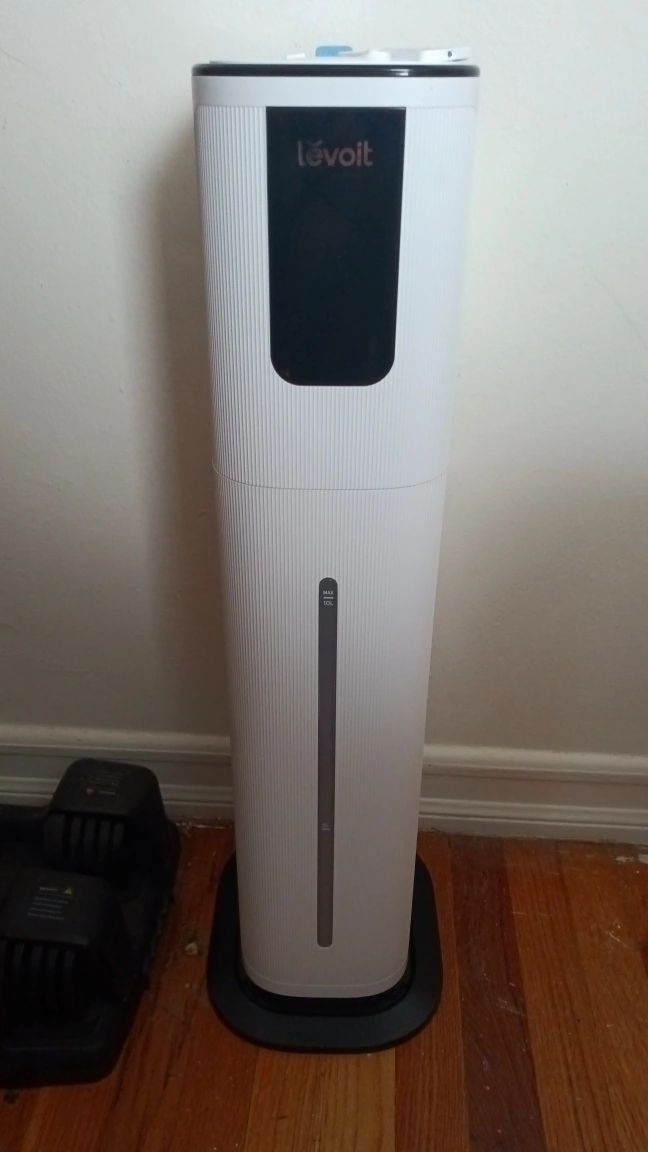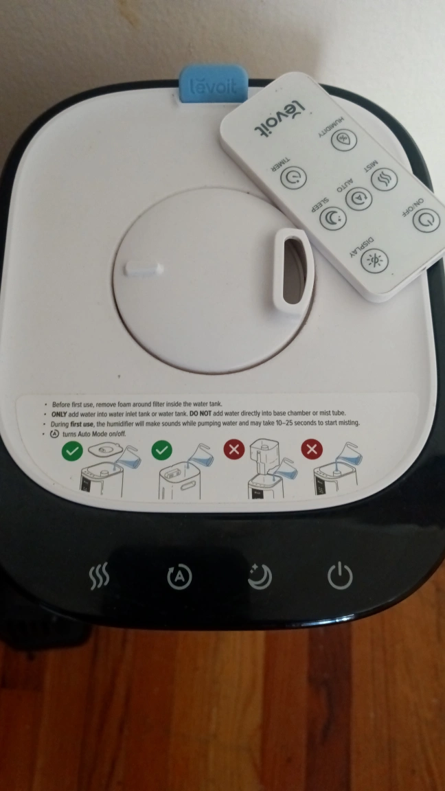 White humidifier with remote. It has a black base and a black stripe going around the center. The tank has a clear window to see the water level. The remote has an on/off button, mist, auto, sleep, humidity, timer, and display. The device comes with a filter . The humidifier was barely used. It is in excellent condition.