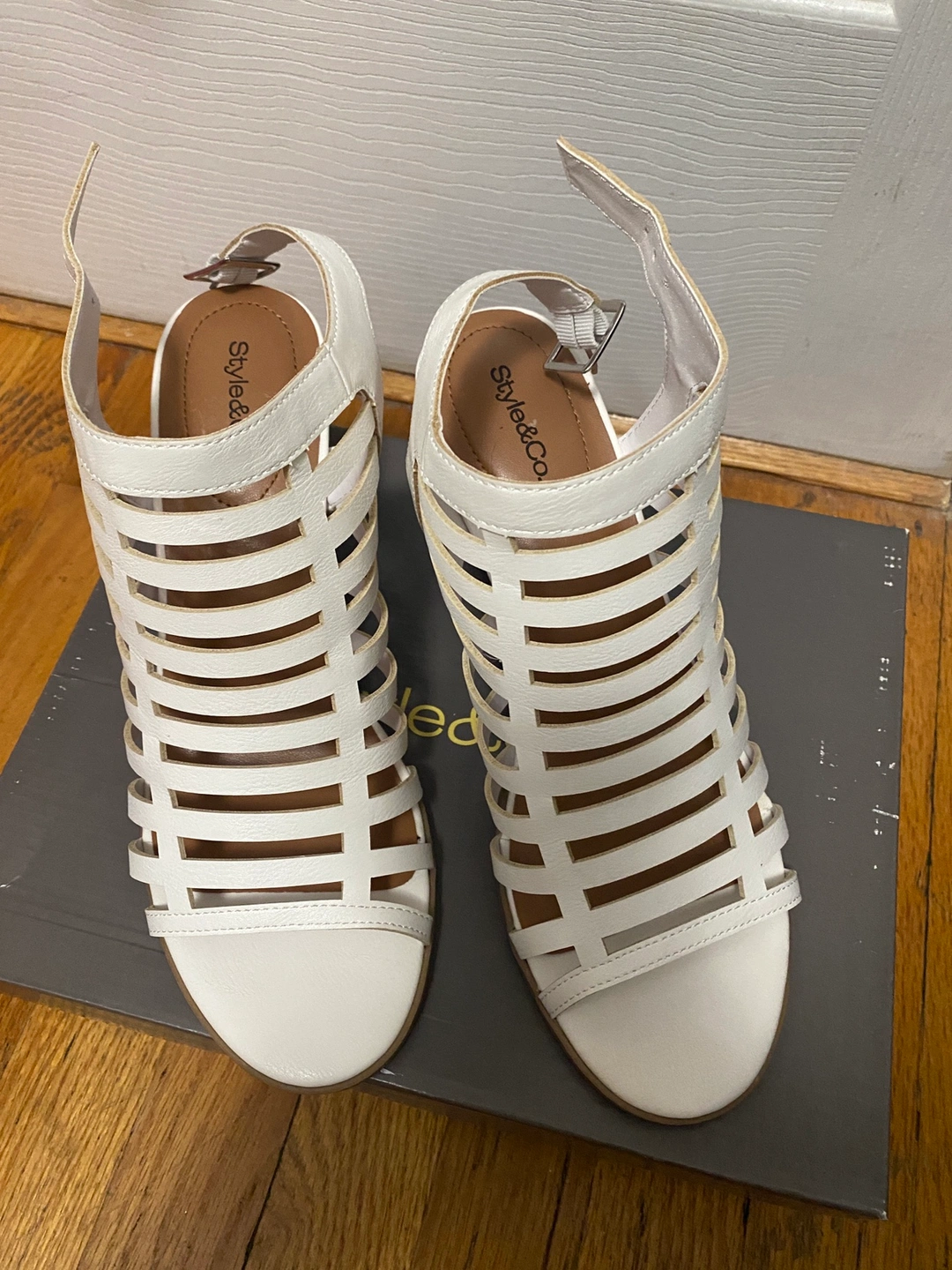 These are white heeled sandals with an ankle strap. They feature a cage-like design with horizontal straps. They are in a peep toe style.