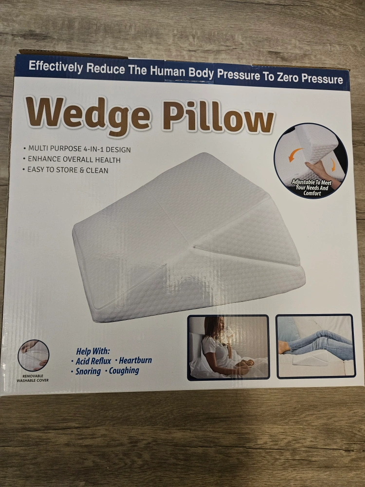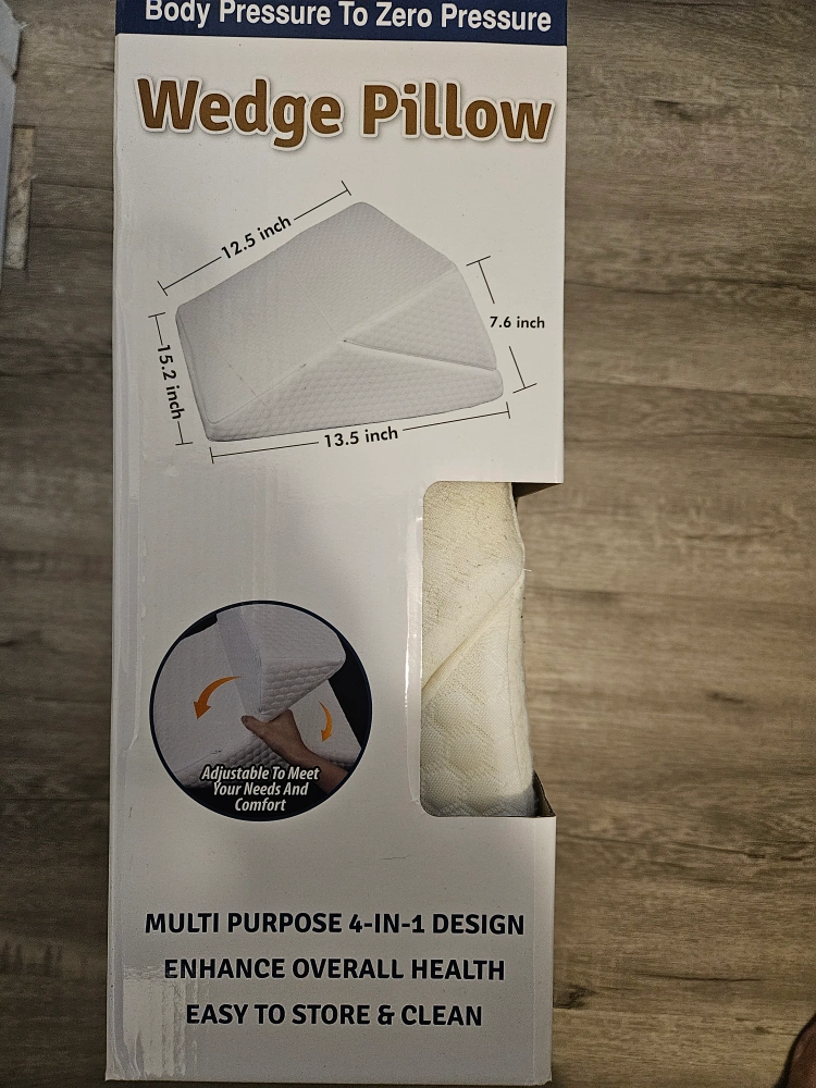 White wedge pillow with a removable washable cover. It is a multi-purpose 4-in-1 design. It can help with acid reflux, heartburn, snoring and coughing. It is adjustable to meet your needs and comfort. It is easy to store and clean. The measurements are 15.2 inches, 12.5 inches, 13.5 inches and 7.6 inches.