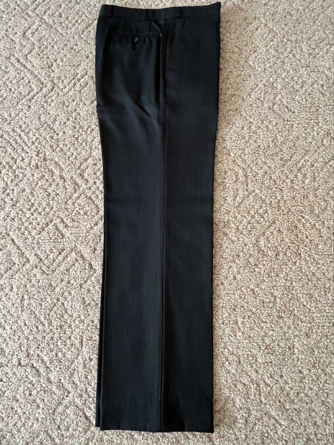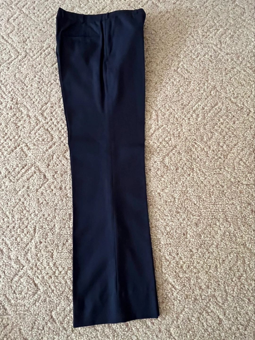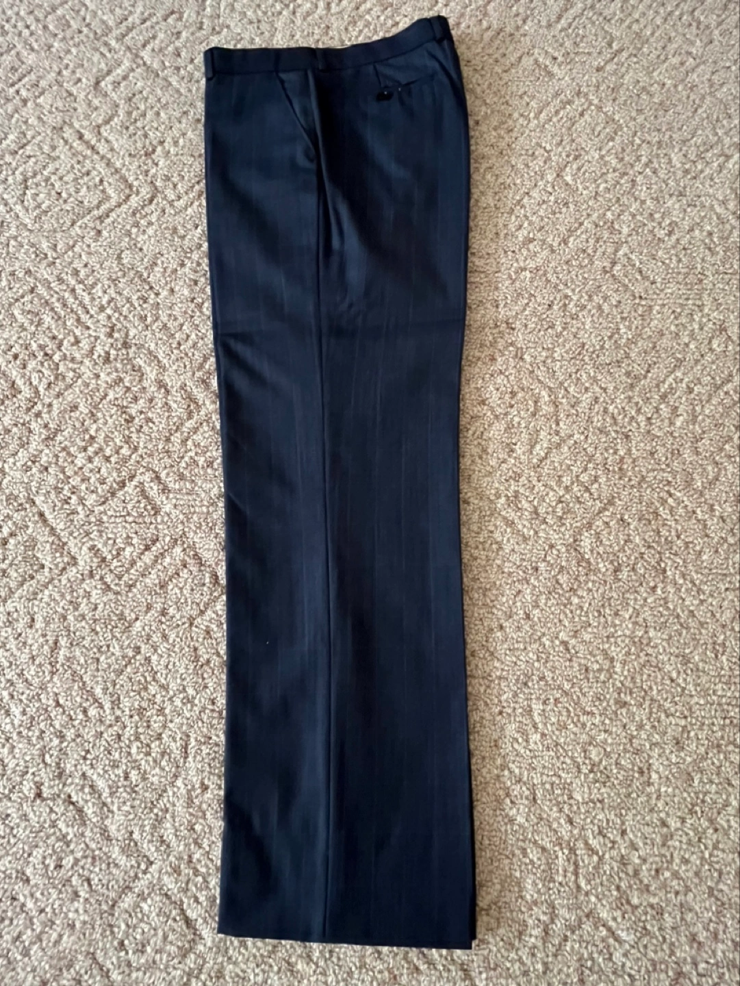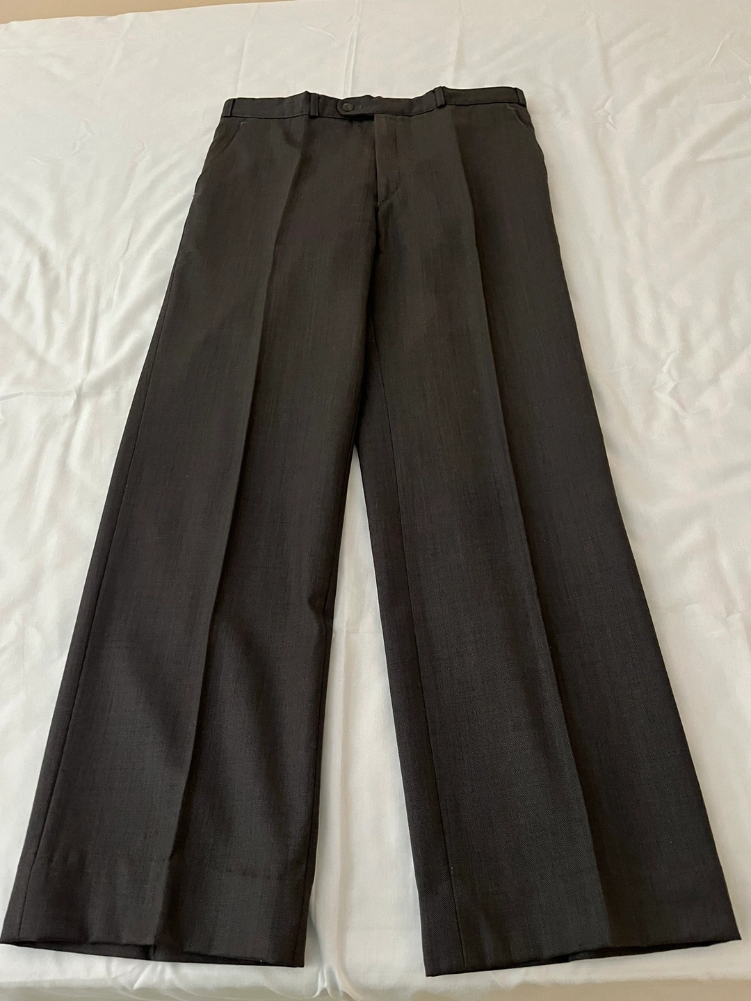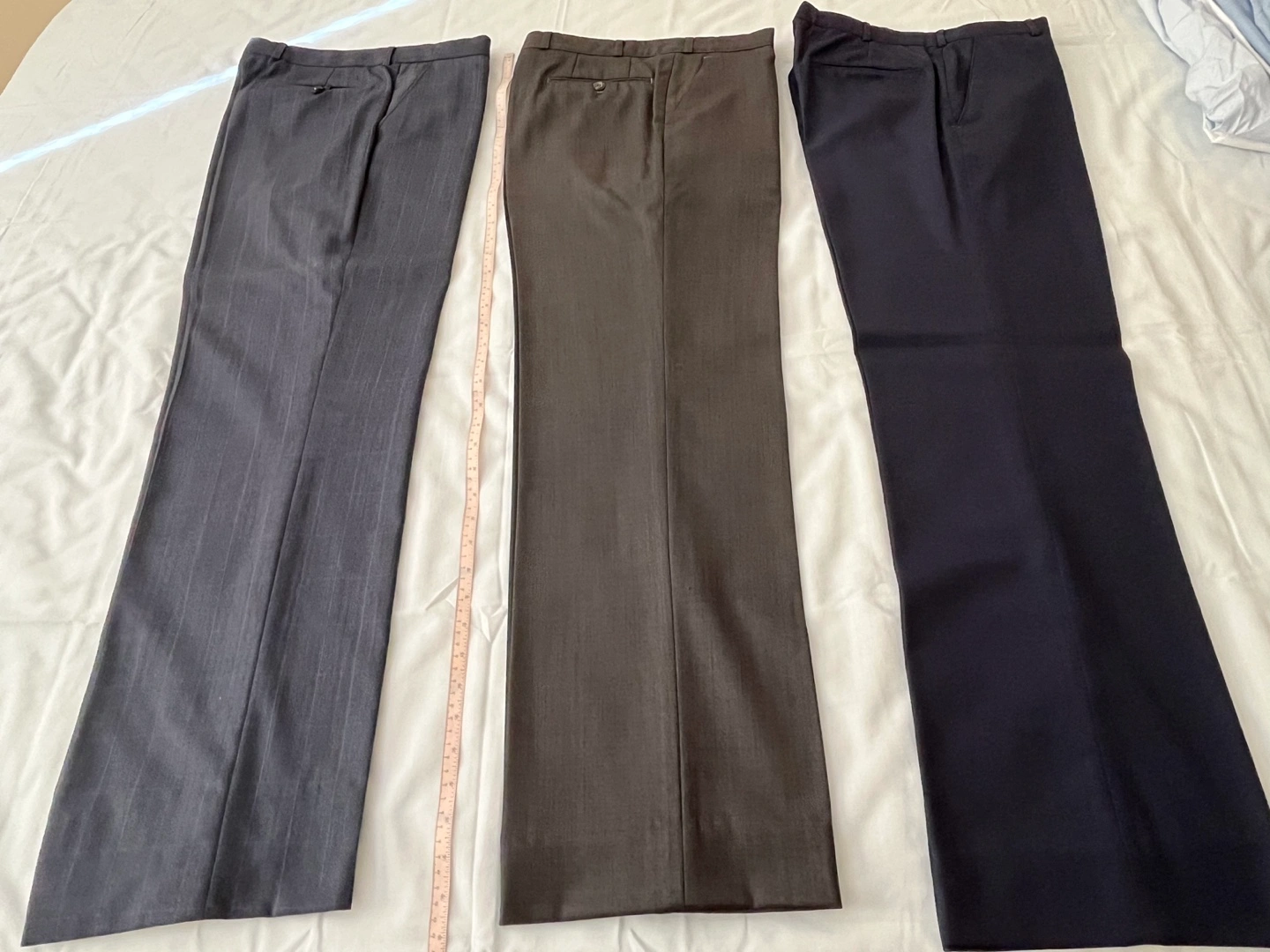 Three pairs of men's dress pants, one in dark grey, one in brown and one in navy.