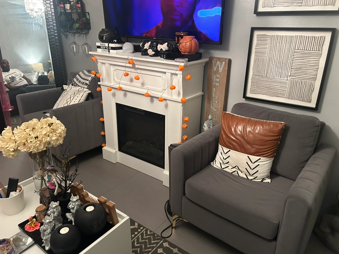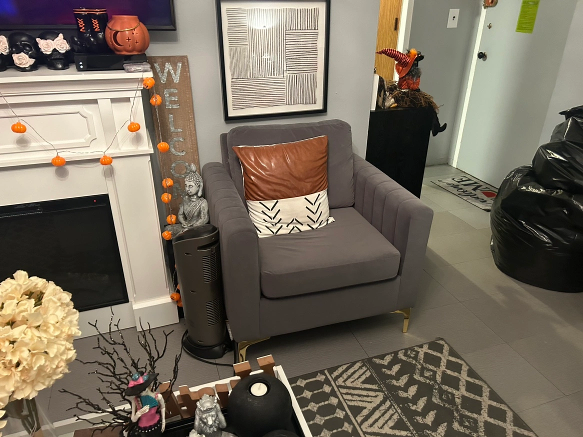 Comfortable and stylish armchair with a soft gray velvet fabric and gold legs. The chair is in good condition and would be a great addition to any living room.
