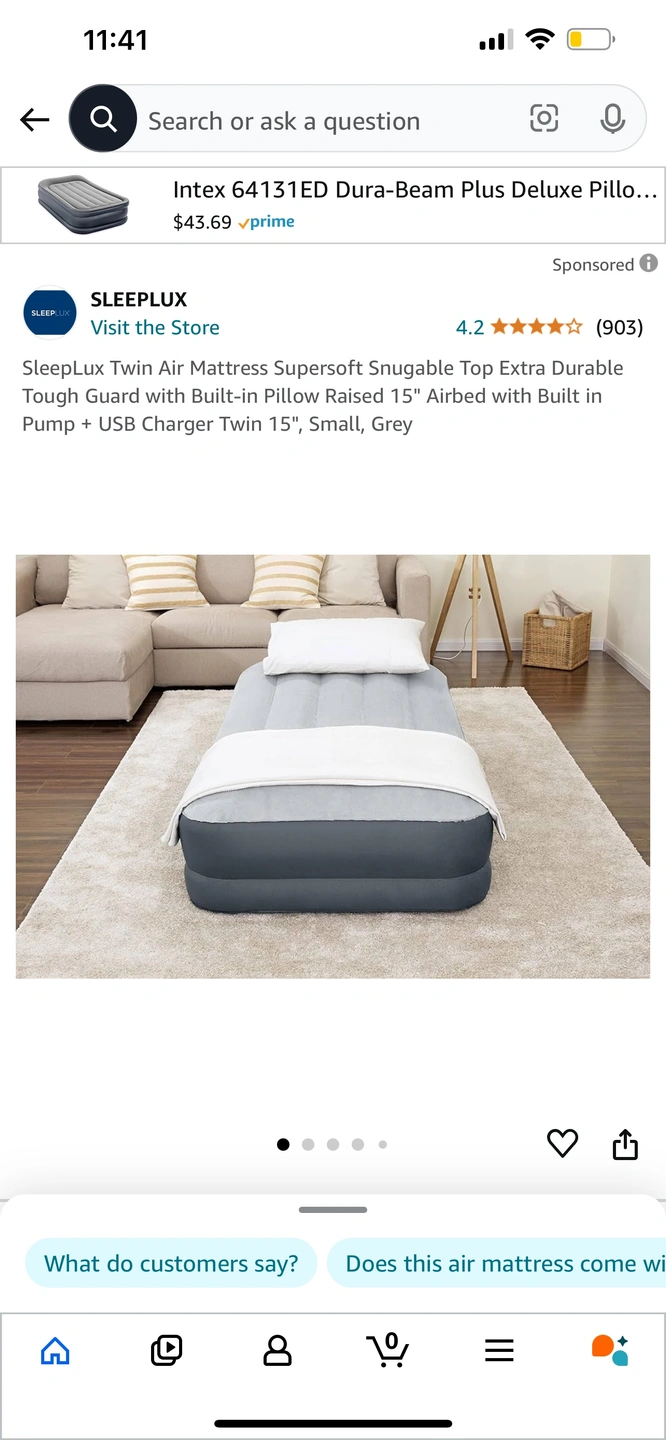 Twin size air mattress with built in pump and USB charger. Comes with a grey flocked top.