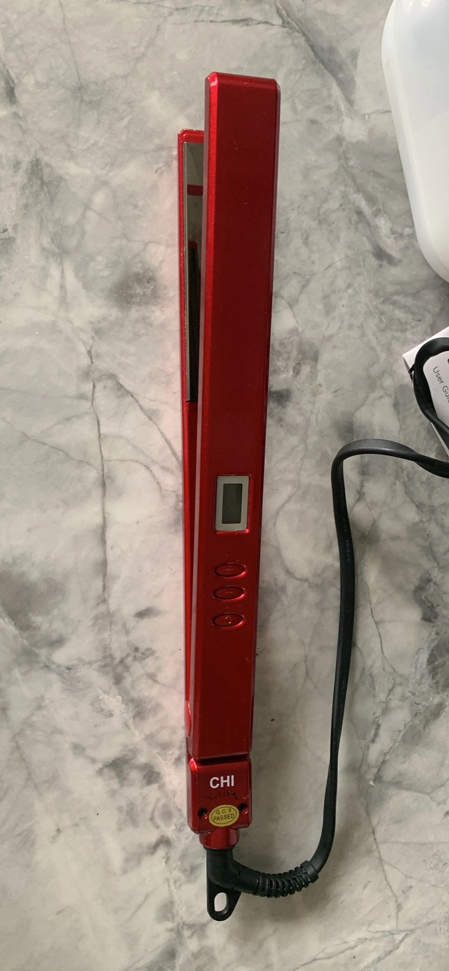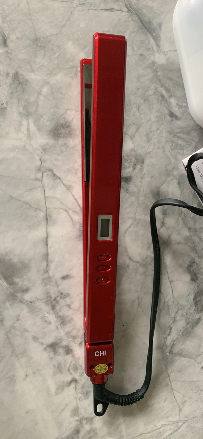Chi air Ulta Beauty Red Temperature Control Hairstyling Iron, Red CHI hair straightener with a digital temperature display. It has multiple heat settings.
