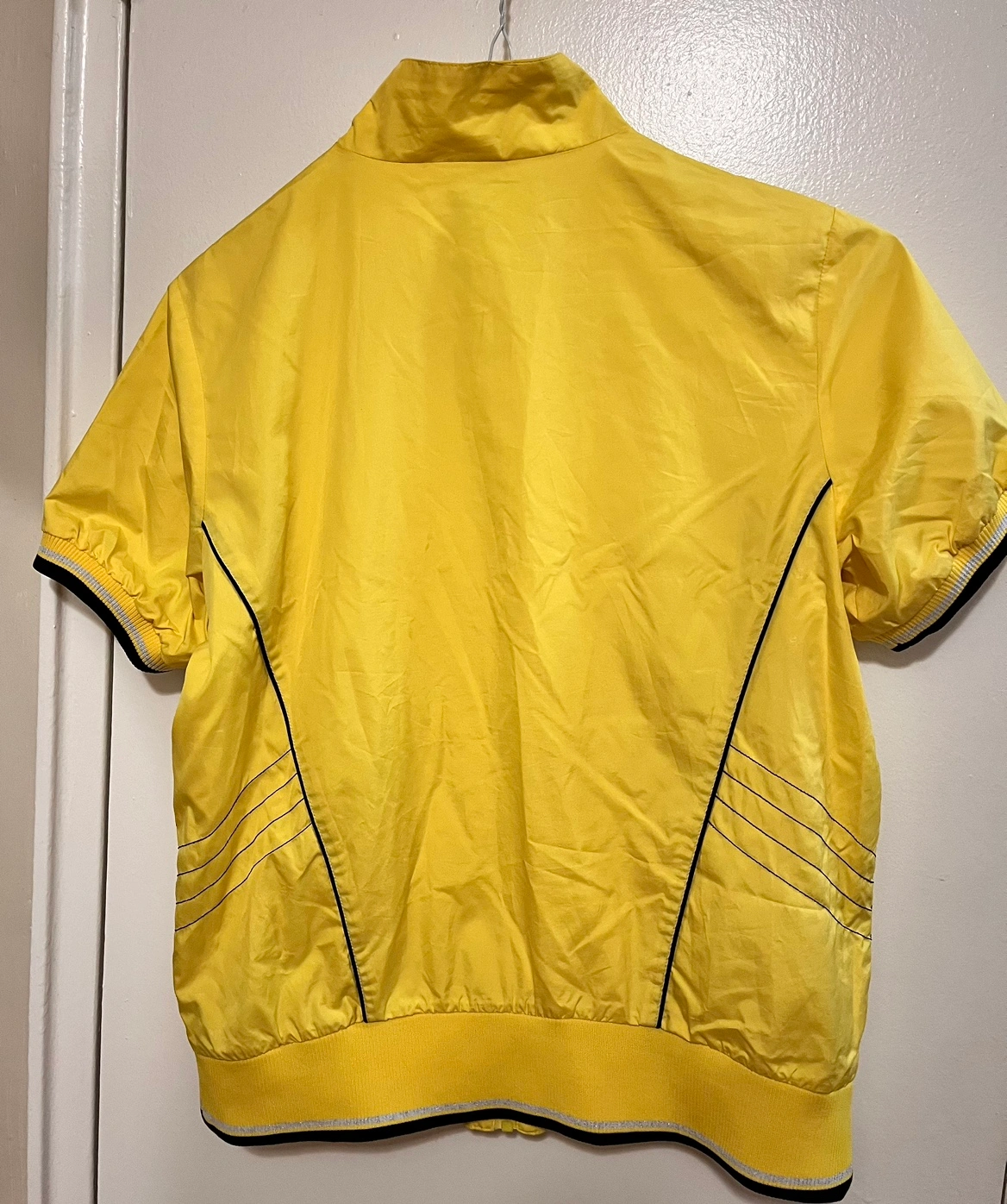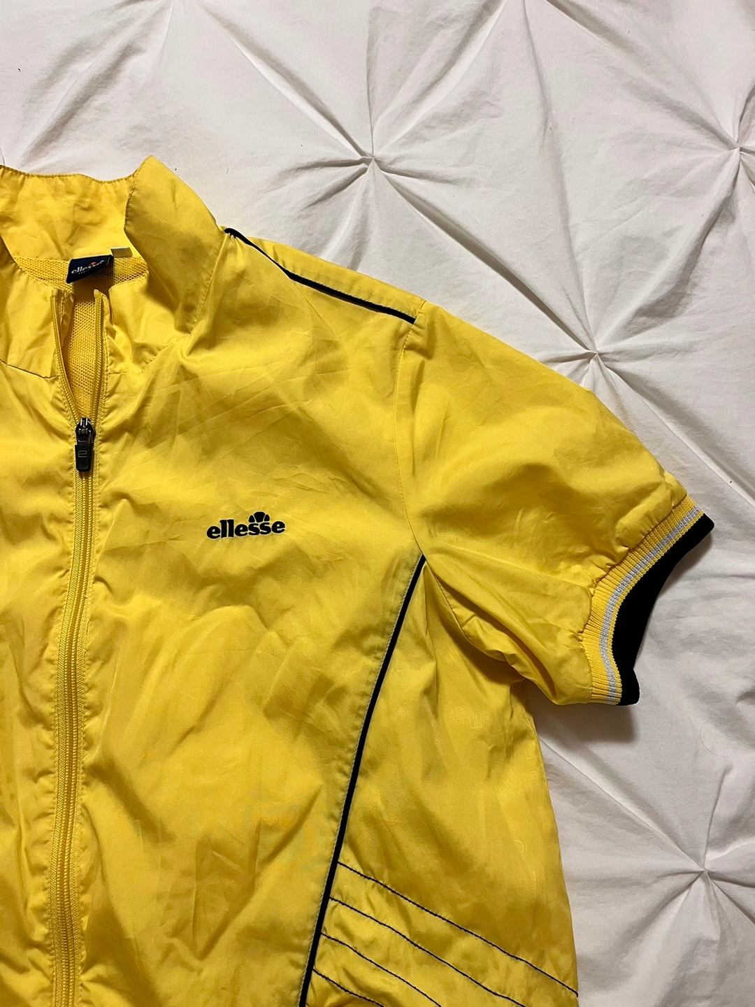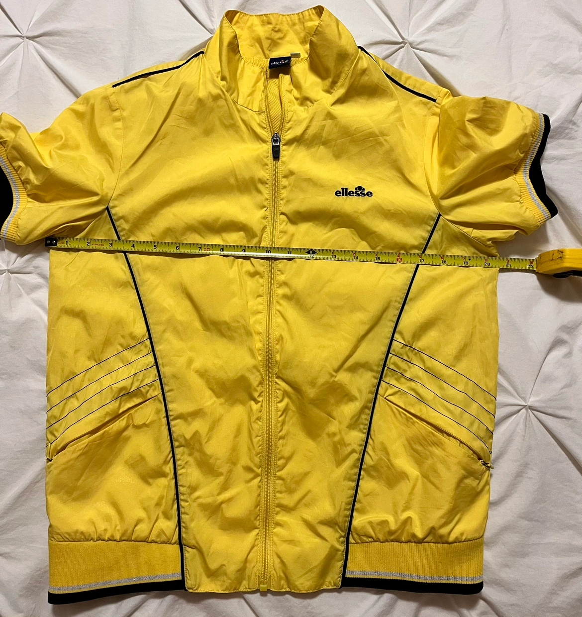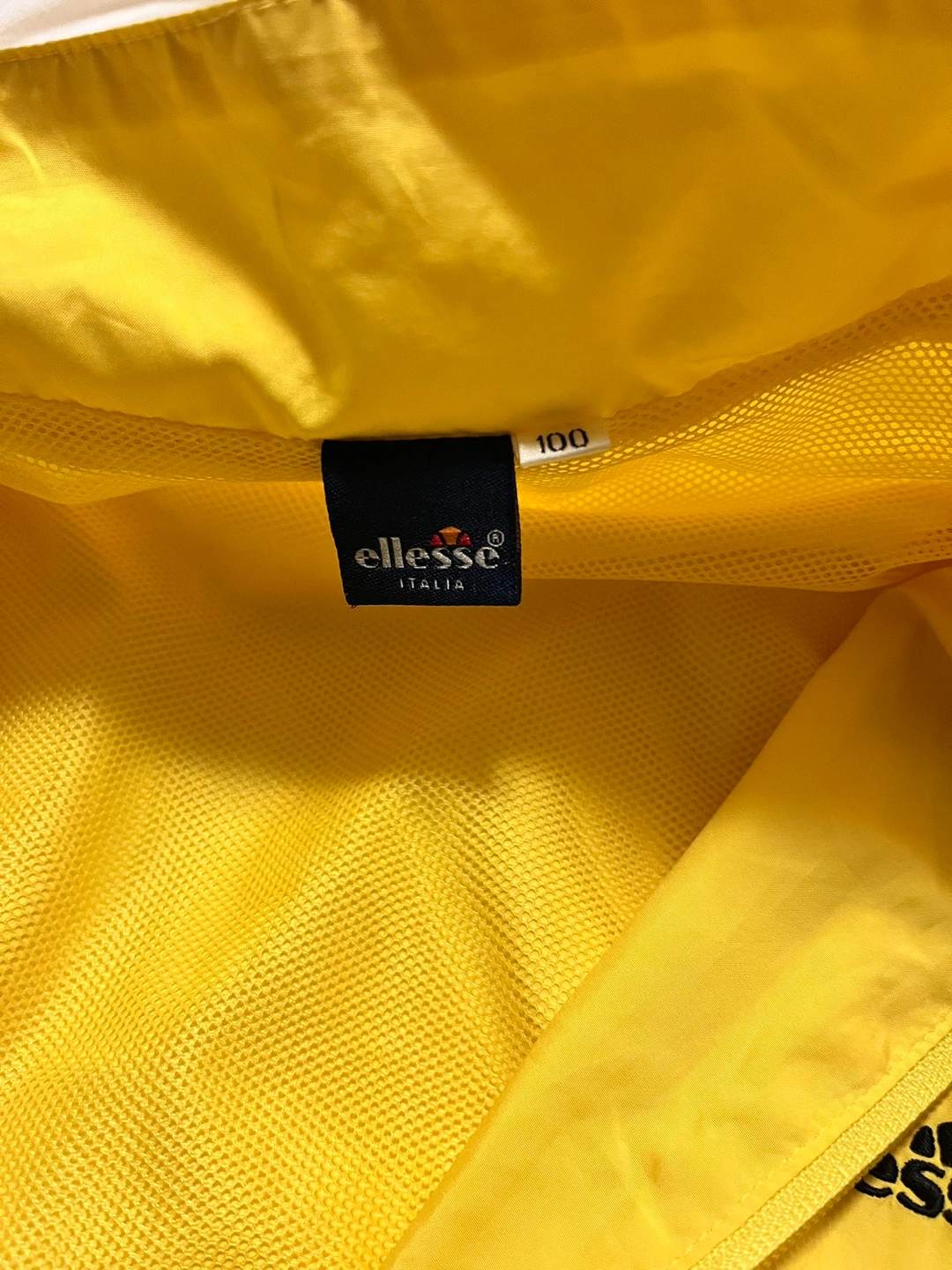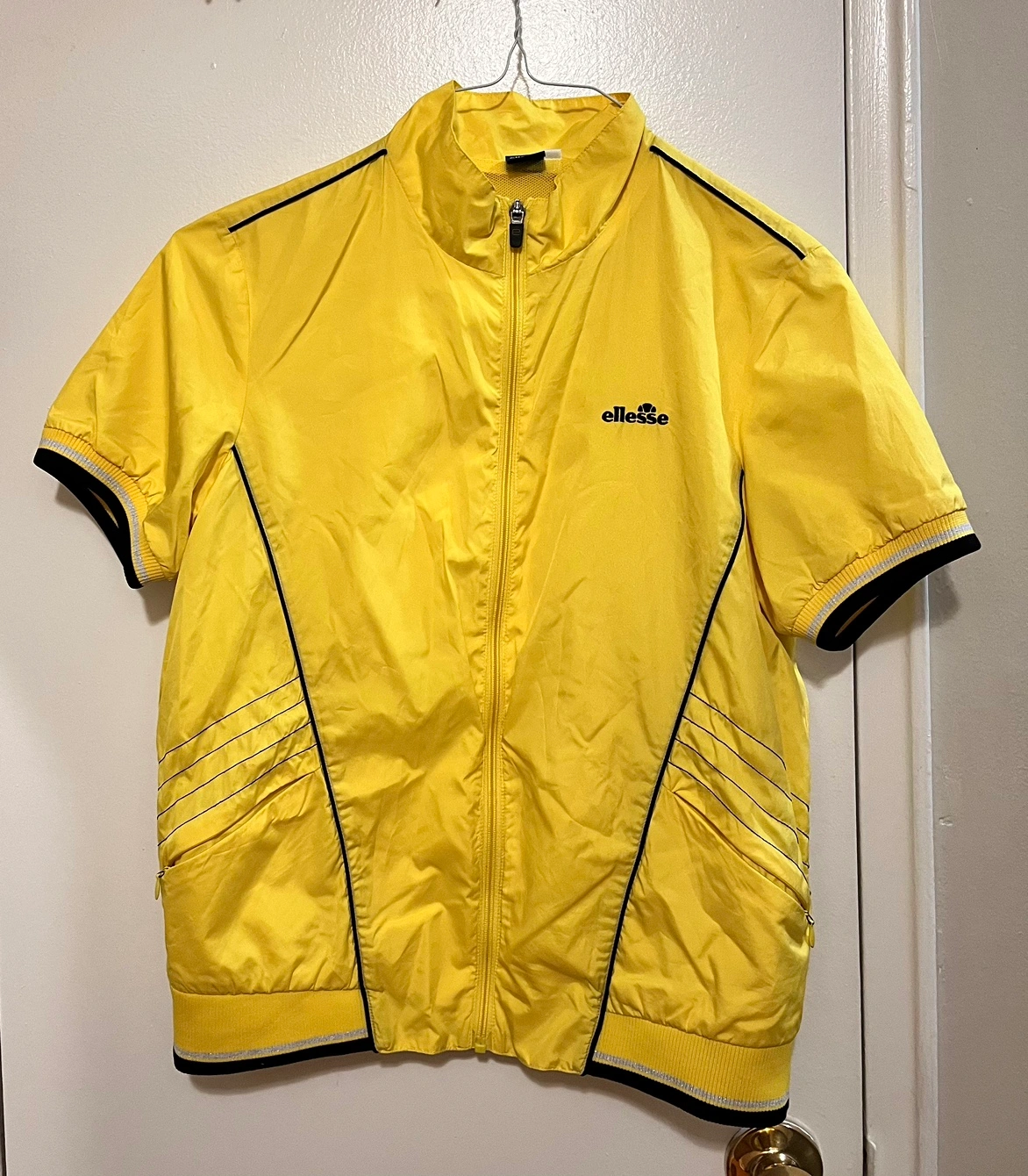 Yellow ellesse jacket with black trim. It has a full zip, two front pockets with zipper , and a stand-up collar. The jacket is size 100.