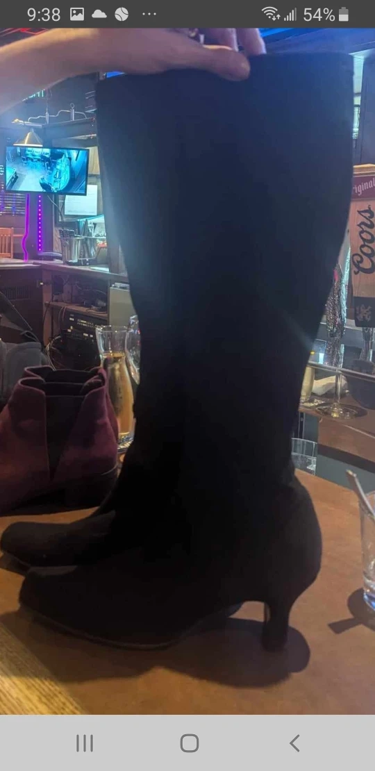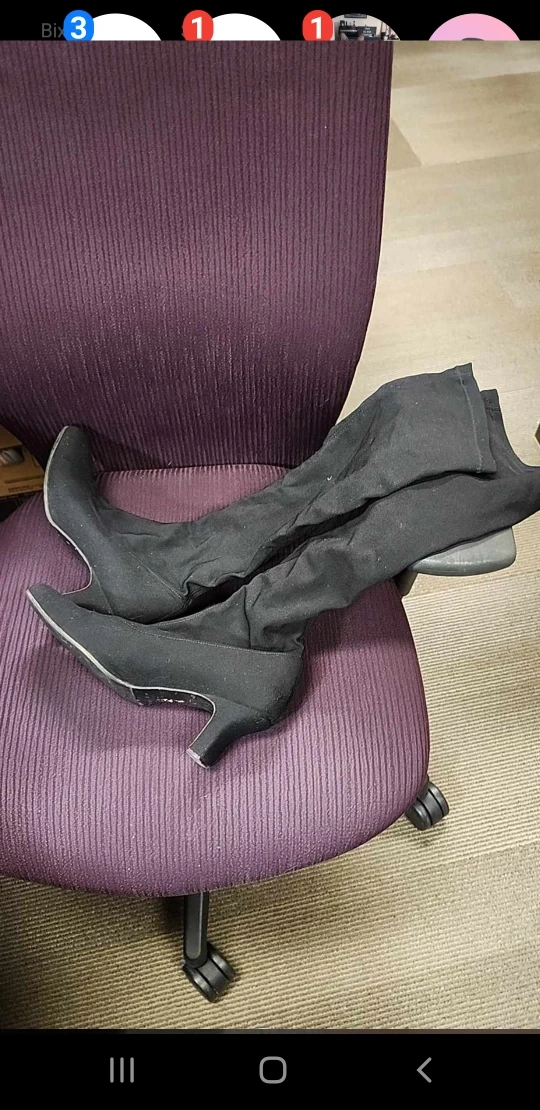 Black knee high boots with a small heel. They are made of a soft suede-like material.slip on like a sock style, very comfy and sexy!