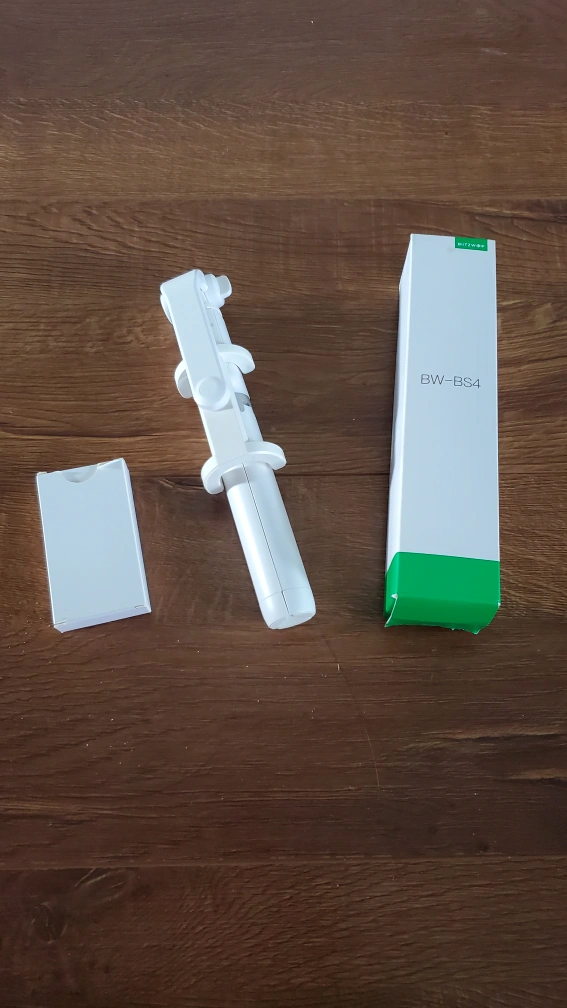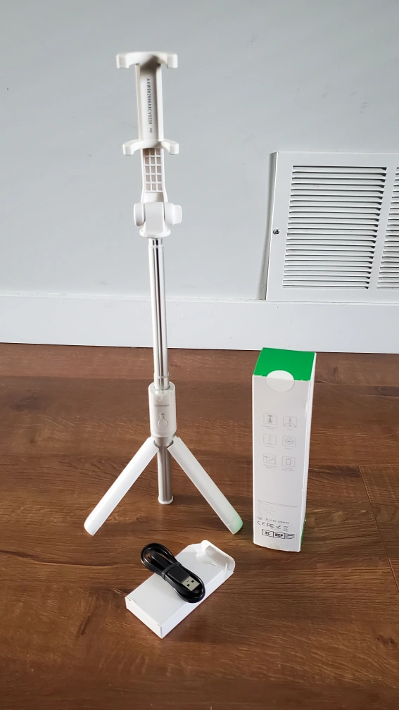 A selfie stick with a tripod and remote. The selfie stick can be extended for wider shots. It is also compatible with a variety of devices. The remote allows you to take pictures from a distance. rechargeable.