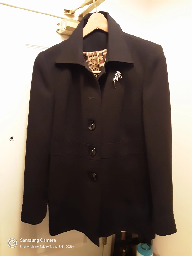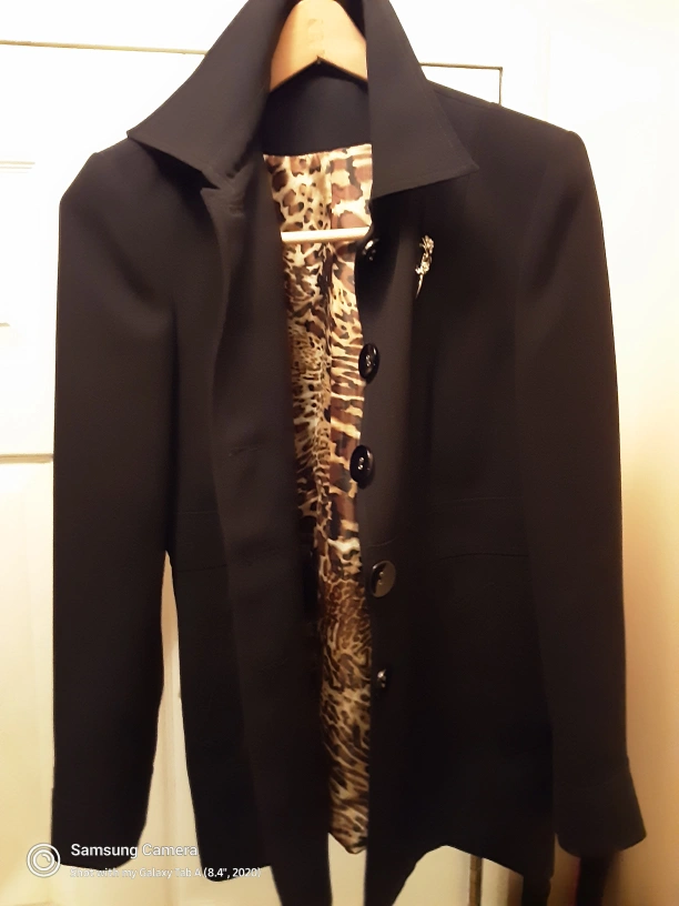 1000+A black blazer with a leopard print lining and a decorative pin. The blazer has a collar, long sleeves, and a button closure. It has a slim fit and is made from a woven fabric. The blazer is in a standard size and is suitable for most body types.