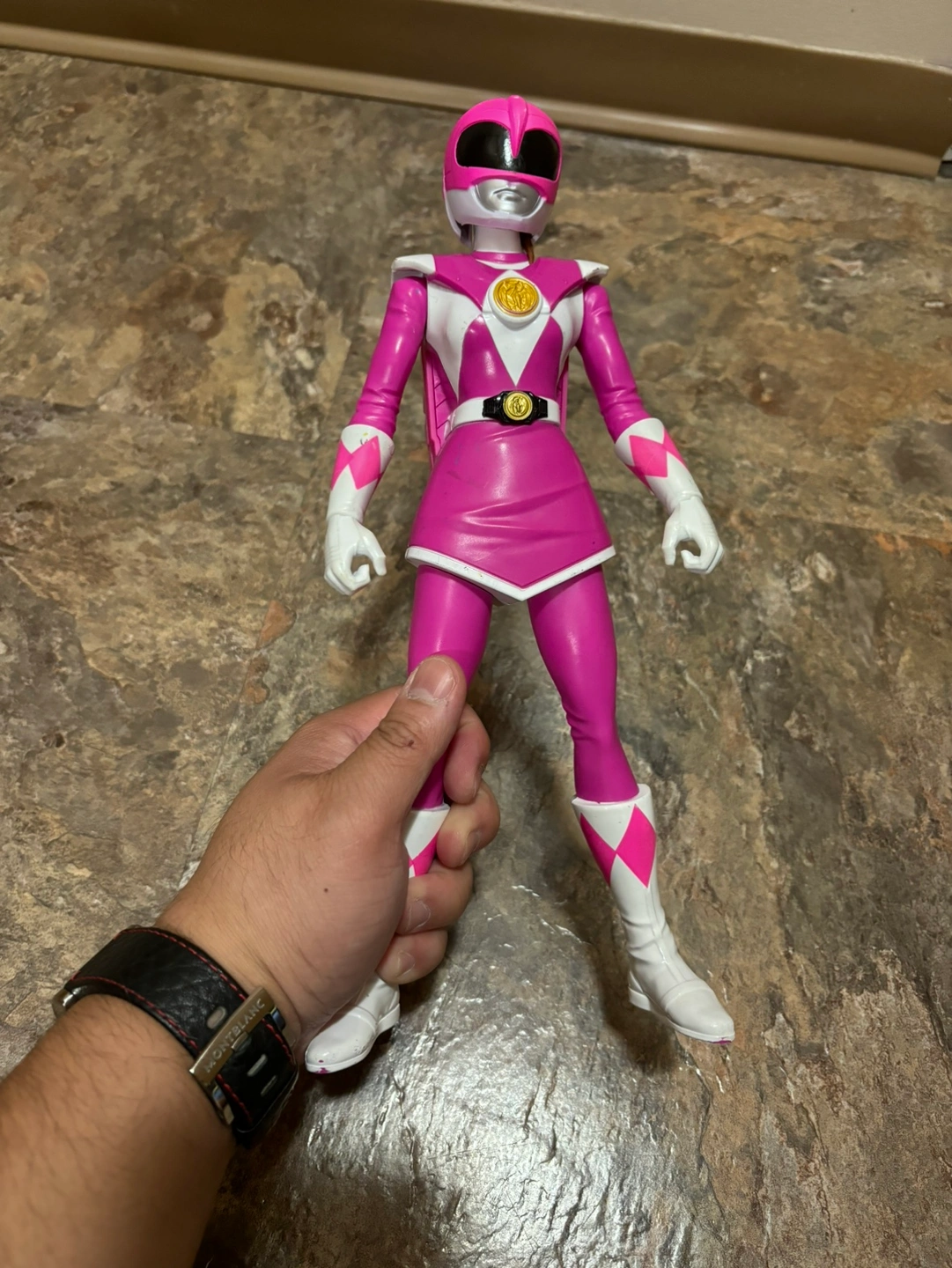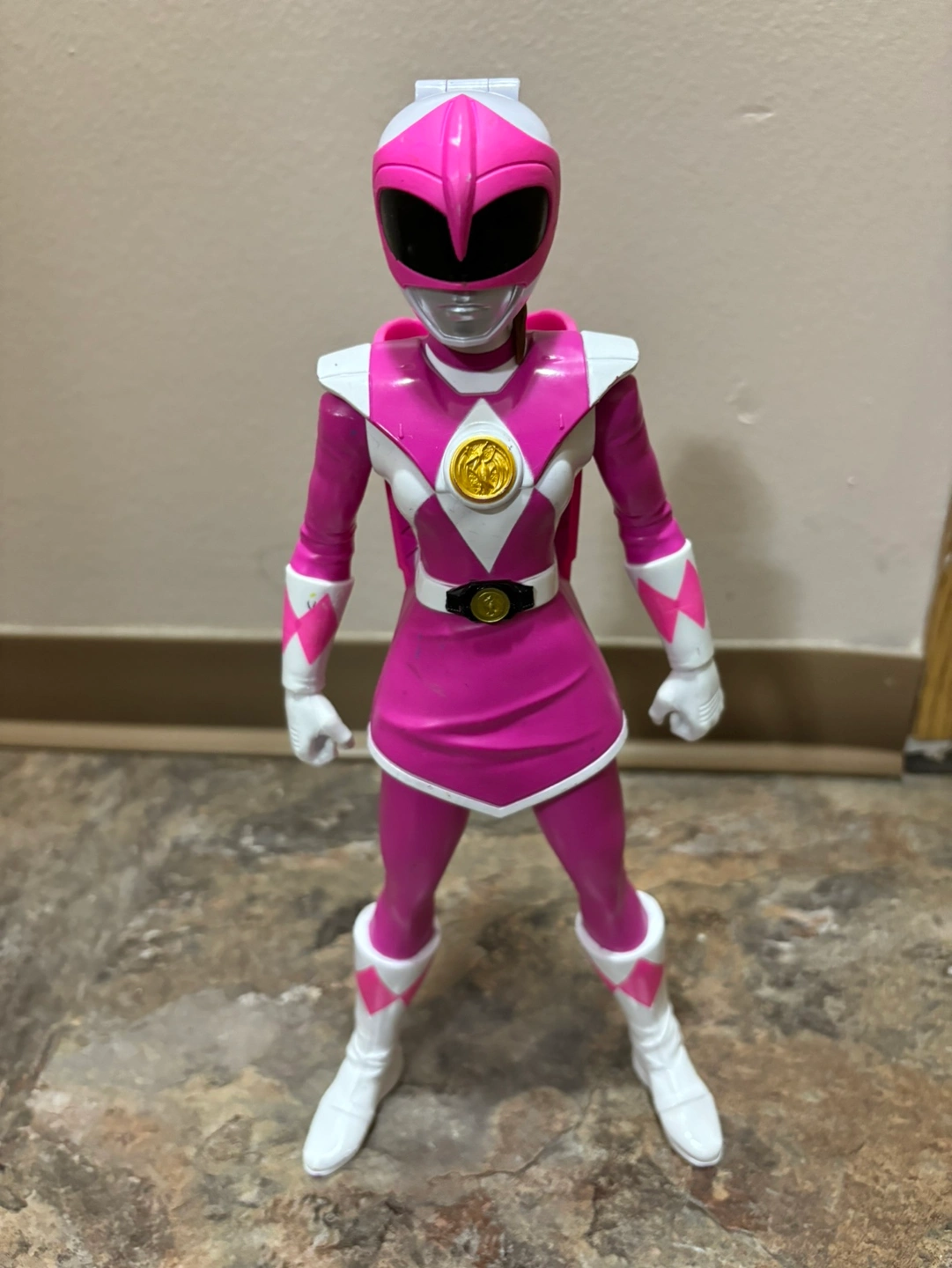 This is a pink power ranger figure. The figure is about 12 inches tall. It comes with a removable backpack and the helmet can be removed to reveal a figure with human features. The figure is posed as if she is standing and ready to fight.