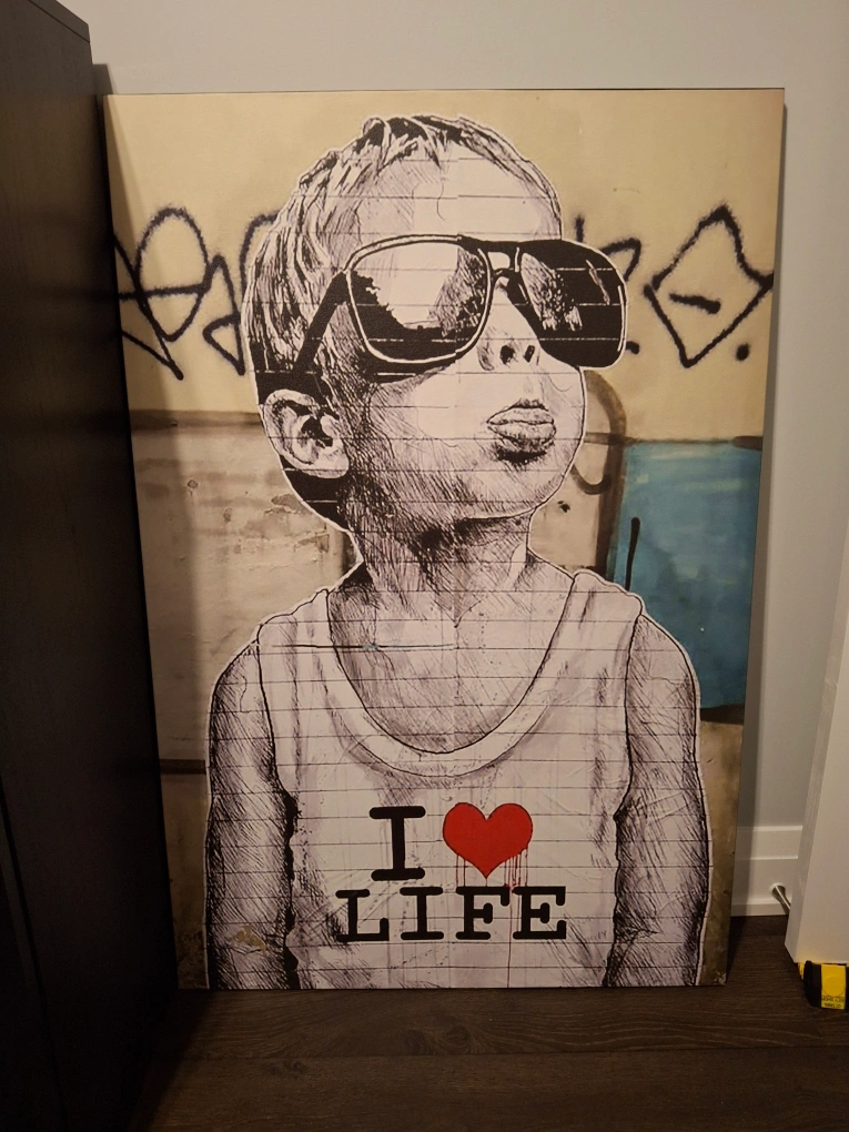 A black and white canvas print of a child wearing sunglasses and a shirt that says "I Love Life" in black text and a red heart. The background is a wall with some graffiti on it. The print is framed in a thin black frame.