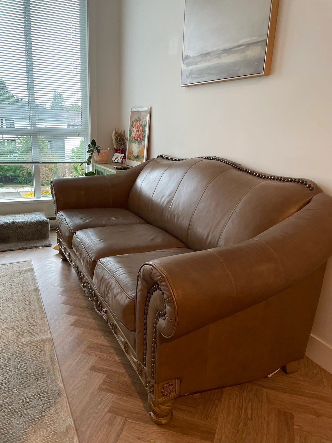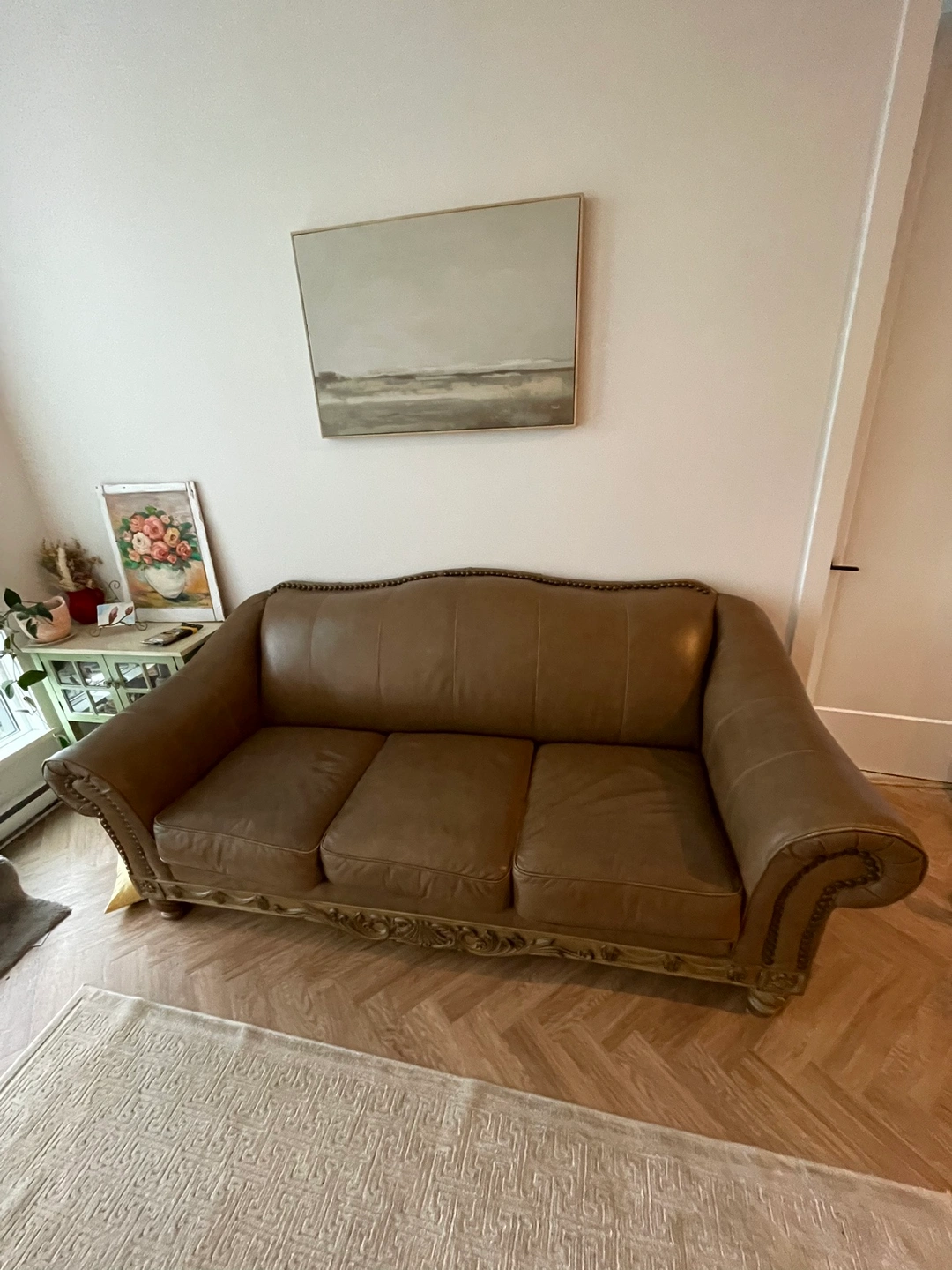 Authentic Leather Sofa with engraved beautiful frame. Regular wear and tear, one missing button but is still perfectly fine otherwise. Moisture pad underneath sofa has been updated and replaced. Soft and comfortable.