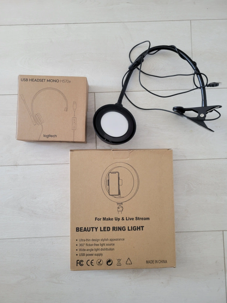 Work desk essentials- Clamp desk lamp, Ring light, USB headset